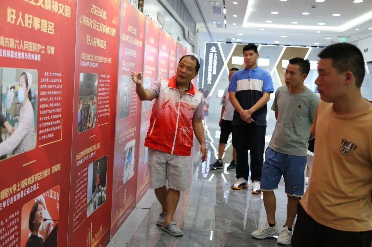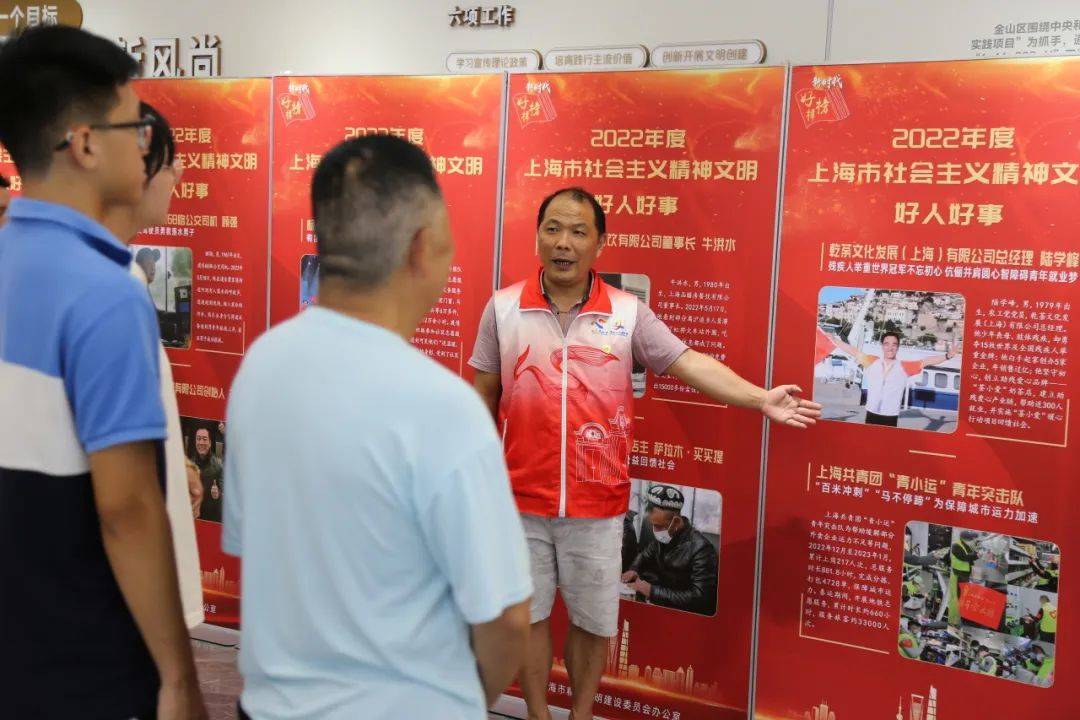 6月24日金山区巡展首日,中国好人、第一届全国文明家庭、上海市志愿服务优秀组织者、龚建强志愿服务工作室带头人龚建强作为金山区巡展讲解志愿者,为前来观展的市民、志愿者、中小学生等,进行观展讲解。