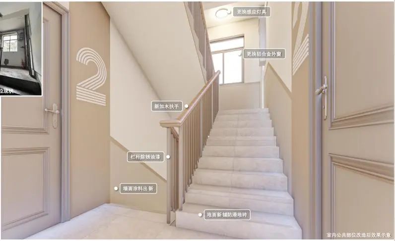在此次小区精品改造中,小区除了对房屋外立面、屋顶、单元门头进行重新修缮翻新外,还将在楼道内重新粉刷涂料、加装木质扶手、铺设防滑易清洁的地砖,营造舒适温馨、安全美观的“家门口”环境,让居民的回家路更加舒心。