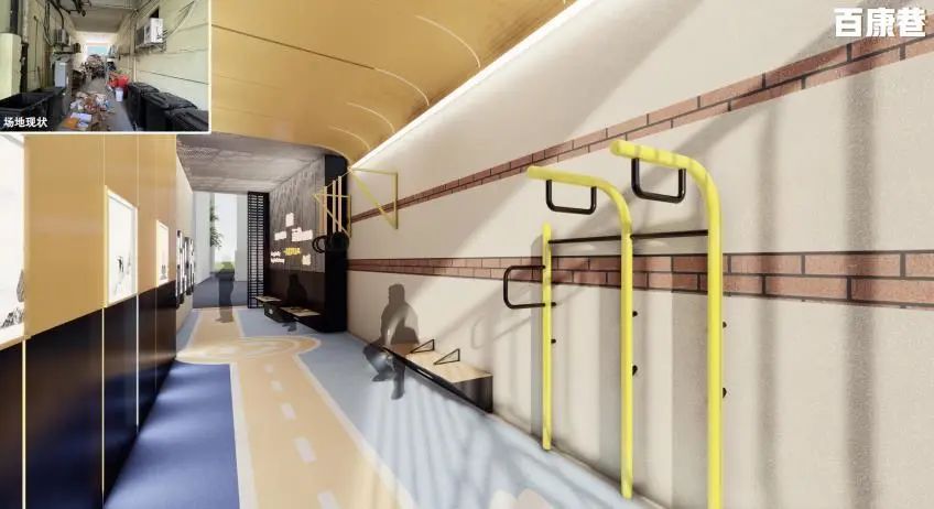 此外,针对小区公共空间面积狭小的现状,沈南小区还想办法“螺蛳壳里做道场”,计划把堆放杂物的 “过街弄”改造为可供休憩、健身的娱乐场地“百康巷”,不仅提高了公共空间的利用率,还让居民在雨天有了休闲的空间。