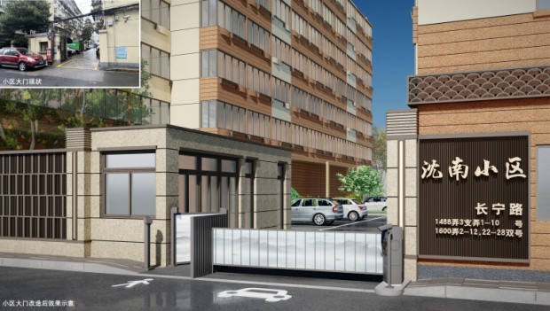 针对大门辨识度较低、门头形象简陋、未设置道闸和门禁设施等问题,沈南小区将把门卫室向左挪动,扩大大门面积,更换道闸,实现人车分离,保障人行安全。