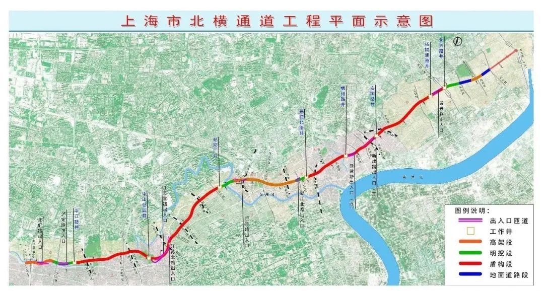 由上海城投公路投资(集团)有限公司投资建设、上海建工集团股份有限公司承建的北横通道新建工程全长约19.1公里,地下隧道段长约14.7公里,其中东段隧道长6.9公里。