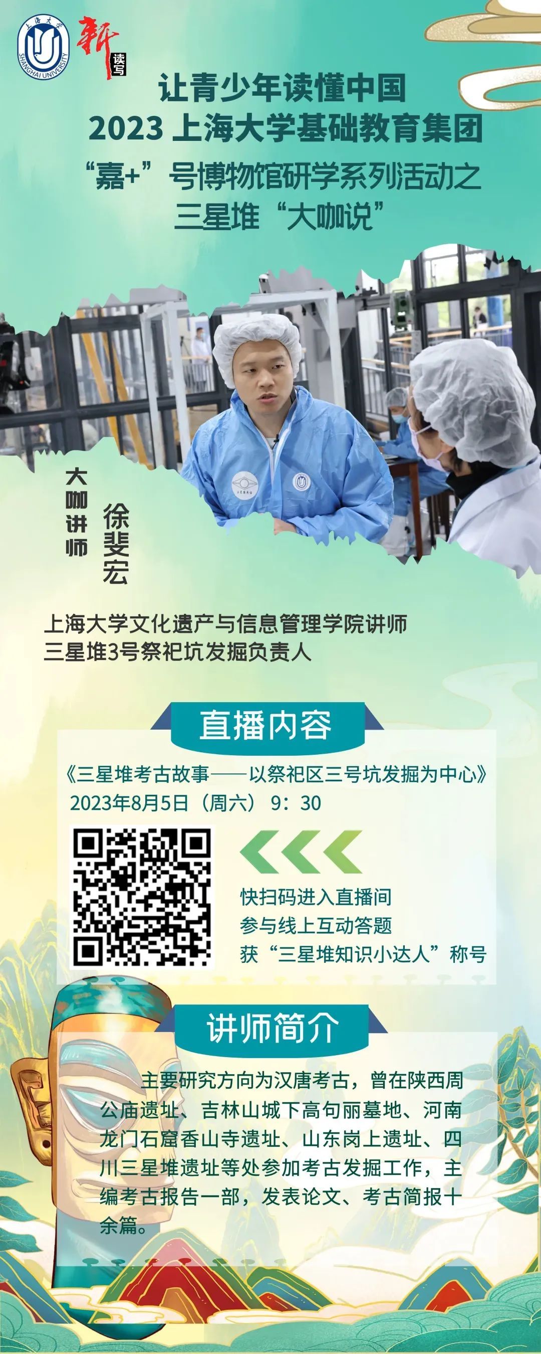 讲座直播过程中,观众也可参与线上互动答题,直播间将实时发布20道互动题目,观众可凭答题积分获得由上海大学基础教育集团与《新读写》编辑部共同颁发的“三星堆知识小达人”电子证书。