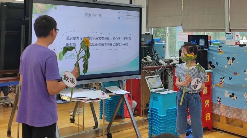 昨天(8月3日)下午,新泾镇爱心暑托班传来阵阵铿锵有力的对话。原来,孩子们正在进行角色扮演,宣传反校园欺凌、反暴力。活动中,除了角色扮演,未保站社工还结合漫画、沉浸式配音等生动有趣的方式,让孩子们设身处地感受被欺凌者的心情,学习在遭遇这种情况时如何保护自己和他人。
