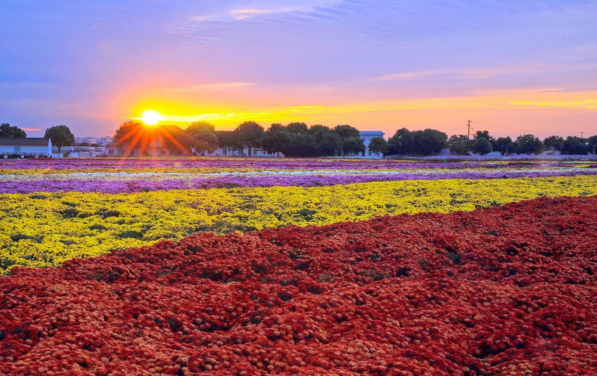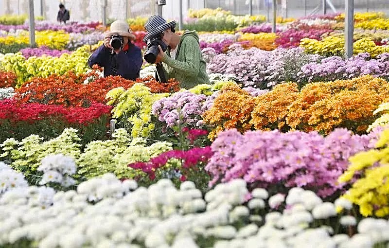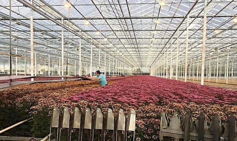 目前,温室内培育有45万株菊花、24万株菊花苗,包含300多种品种,常见黄、白两种花色,亦有紫色、绿色、五彩色等丰富花色,多数出口至韩国、日本等国家。此外,基地拥有较为成熟的种源技术,现已能够基本实现菊花色彩定制,进一步打开了市场、拓宽了销路。