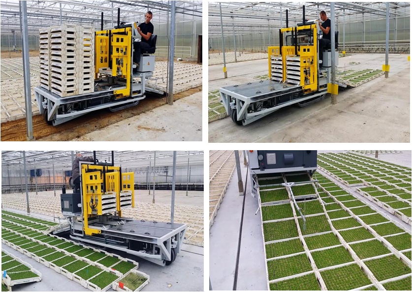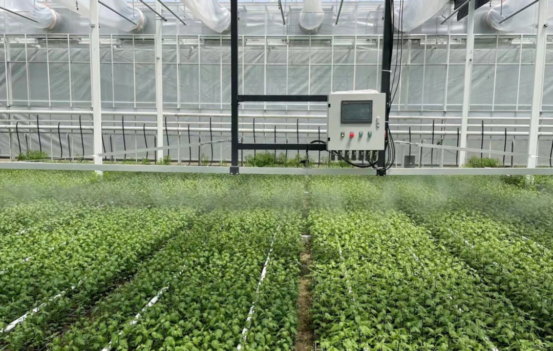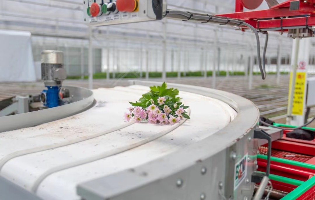 播种方面,采用基质块制造设备、插穗扦插机器人,做到自动识别、抓取、插穗,提高种苗扦插工作效率,有效降低能耗成本,实现菊苗扦插智能化、工厂化。切花和盆花生产线采用智慧农业系统,配备全天候光温控制、水肥一体化灌溉、地下排水、自动传送、机械化采收包装等系统,构建规模化生产模式,生产效能是人工的4-5倍。
