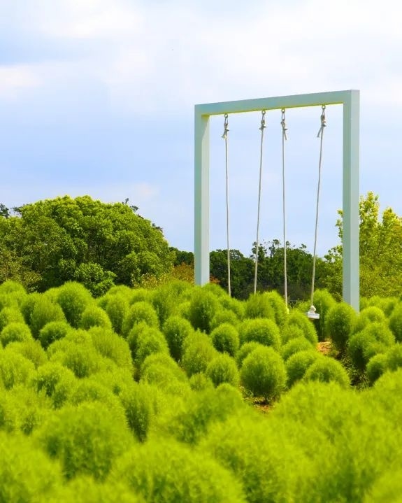 在花开海上生态园的芳香花园内,远远望去,大片的绿色“毛毛球”随风摇曳,矮胖圆滚,甚是可爱。从空中俯瞰,一株株圆滚滚的地肤,随着高低起伏的地势,错落有致,层层叠叠,汇聚成一大片绿色的海洋。目前,这片区域的地肤正处于生长期,叶子呈现嫩绿色,形态变化日新月异,而到了秋季,就会开始逐渐变色。