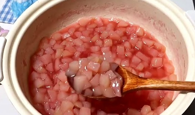 3、桃子皮里加大约50克的水,放在不粘锅内用中火煮软,直到水变成红色,捞出果皮,放入果肉丁翻炒,中途加入白砂糖后继续翻炒,直到收干水分,桃子果酱就做好了。