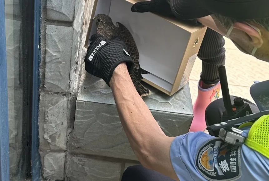 王女士随即拨打了110报警求助。接报后,杨浦公安分局长海路派出所民警李勇立即赶往现场。民警做足了准备,戴上了厚厚的防割手套,用戳好洞的鞋盒暂时将鸟儿装下,带回派出所并联系了区林业部门。
