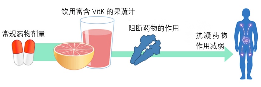 服用富含维生素K的果蔬会增加了体内维生素K的含量,从而消弱了华法林的作用,抗凝效果不佳。这时如果提高华法林的治疗剂量增加抗凝效果,则在不吃果蔬汁的时候造成药物服用过量诱发出血。