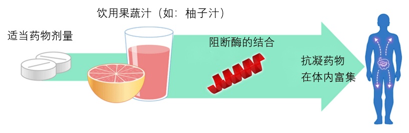 此外,华法林(还有一些其他药物)在小肠中与一种称为CYP3A4酶相互作用。在CYP3A4酶的帮助下药物被分解代谢,经代谢的药物不会进入血液发挥功能。而果蔬汁某些成分可以阻断肠道CYP3A4的作用,因此使得更多的药物进入血液。这些药物在血液内停留的时间更长,而不被代谢。最终导致体内药物富集,诱发出血。例如:某人在服用华法林的同时,喝西柚汁或吃柚子,导致华法林在体内的富集,发生皮下出血。