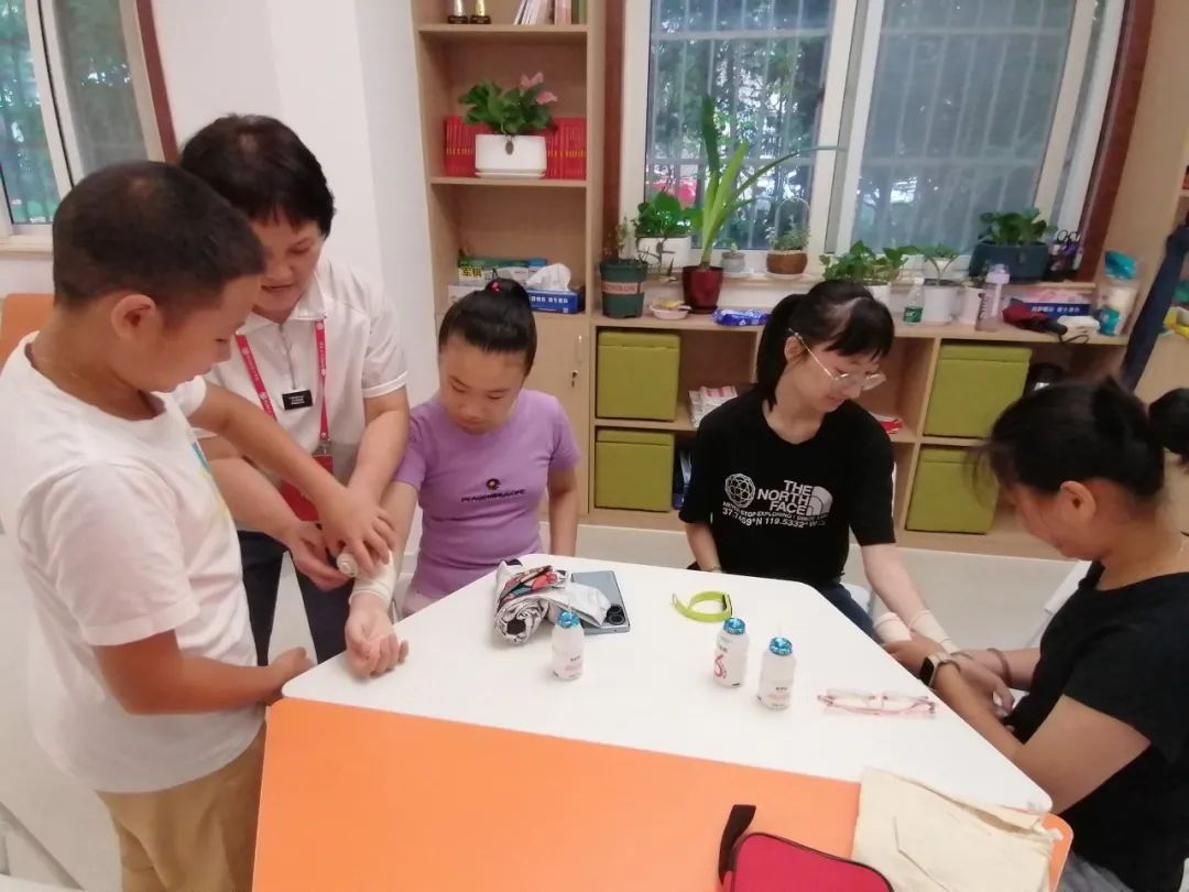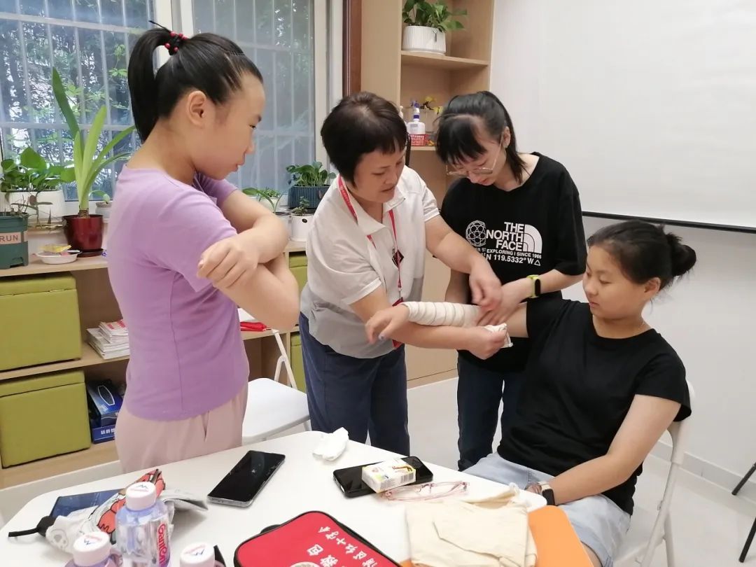 为了提高活动的生动性和实用性,工作人员还组织同学们一起开展了情景演绎活动。“先要检伤、验伤,做出正确判断,然后注意包扎时的操作要领,尤其注意起始位置的选择。”在工作人员的实物演示和手把手指导下,大家变身成了“小小救护员”,快速学会了准确、有效包扎伤口的流程和方法。