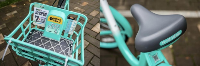 灰色车座、青桔色车筐是新型青桔单车最有辨识度的两个特点,在重点接触的鞍座、车头码、车筐等重点部件做了升级。