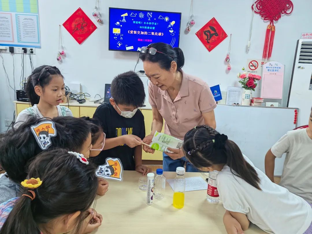 在园南三村居民区内,上海交通大学退休教授高老师与暑期社区挂职的中学生志愿者们精心准备了“探索吧!小小科学家!”系列科普启蒙教育活动,带领孩子们用生活中常见的材料进行科学实验。孩子们用小苏打和白醋进行实验观察二氧化碳的产生;用蜡烛点燃手剪的螺旋纸观察风的形成;用自制净水器观察水的净化过程;用风车了解发电原理……