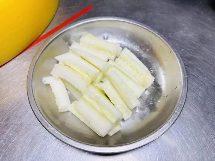 ► 1、老黄瓜去皮去籽,切一寸长的条。