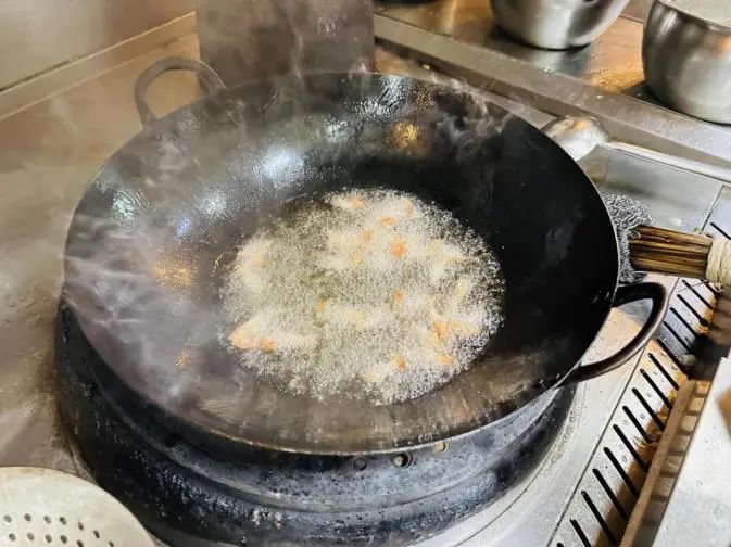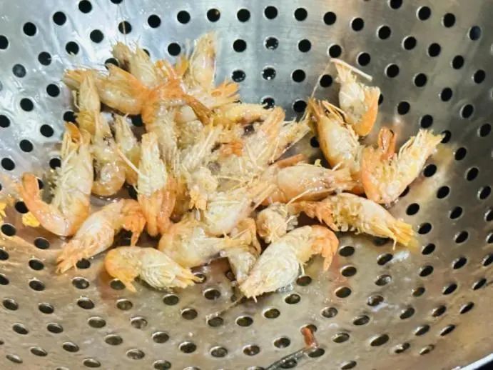 ► 3、油锅起油,把河虾炸脆后捞起。