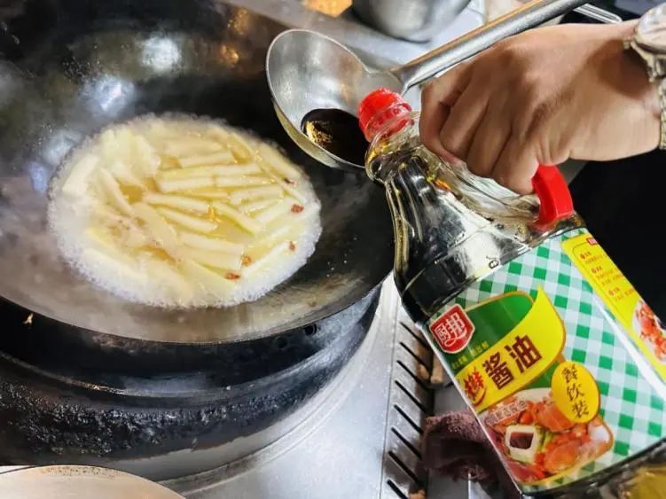 ► 5、加入调味料,再放入炸脆的河虾煮2分钟后起锅。