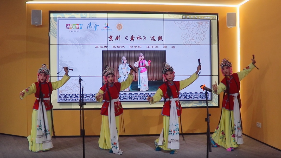 演出开始,小演员们各个粉墨重彩、面若桃花,穿戴着颜色鲜艳的戏服。他们登台表演了京剧《卖水》选段、《苏三起解》选段、《红灯记》中《穷人的孩子早当家》和《都有一颗红亮的心》选段,以及《智取威虎山》选段《今日痛饮庆功酒》等脍炙人口的唱段。每个唱段虽然表演的时间并不长,但是孩子们一招一式、有模有样,在琴师的伴奏下唱得一气呵成,观众席不时报以阵阵掌声。演出中,指导老师上海徐汇燕萍京剧团团长周燕萍,还给大家讲解了京剧花旦的分类和服饰、生旦净末丑分别代表什么人物等京剧知识。一位小演员上台展示了《贵妃醉酒》里杨贵妃的装扮,凤冠霞帔、华丽蟒服、雍容华贵的形象让人大开眼界。