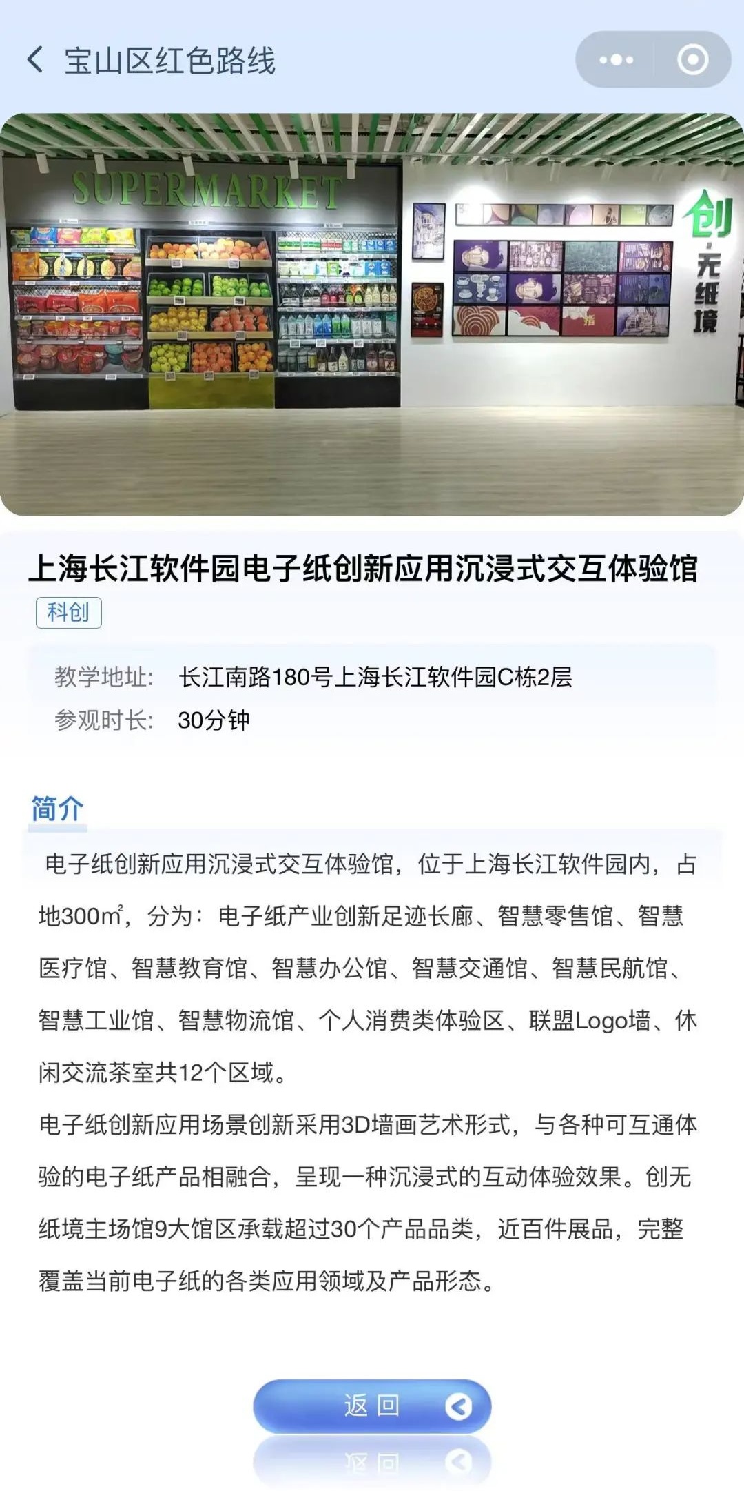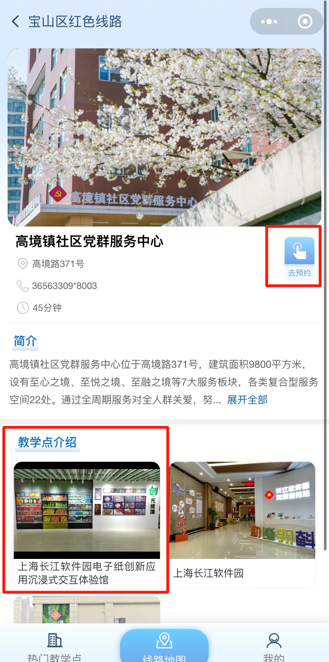 2、通过街镇地图页点击“高境镇”,选择“上海长江软件园电子纸创新应用沉浸式交互体验馆”可查看教学点简介。