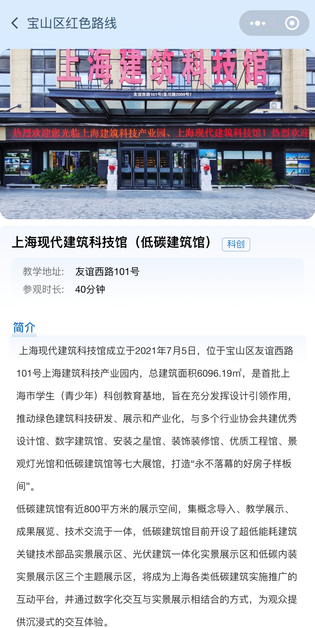 2、通过街镇地图页点击“杨行镇”,选择“上海现代建筑科技馆(低碳建筑馆)”可查看教学点简介。