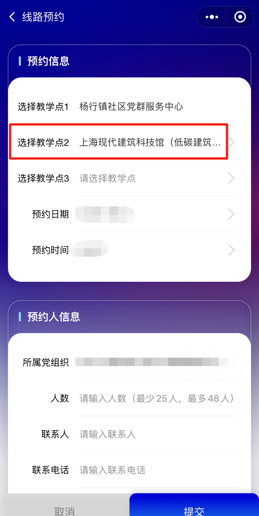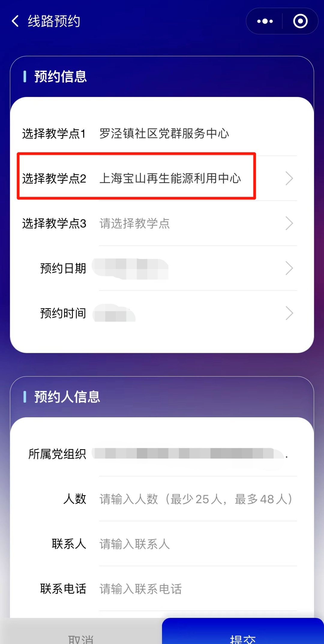 3、在杨行镇详情页,点击“去预约”按钮进入预约页面,填写信息后提交审核。