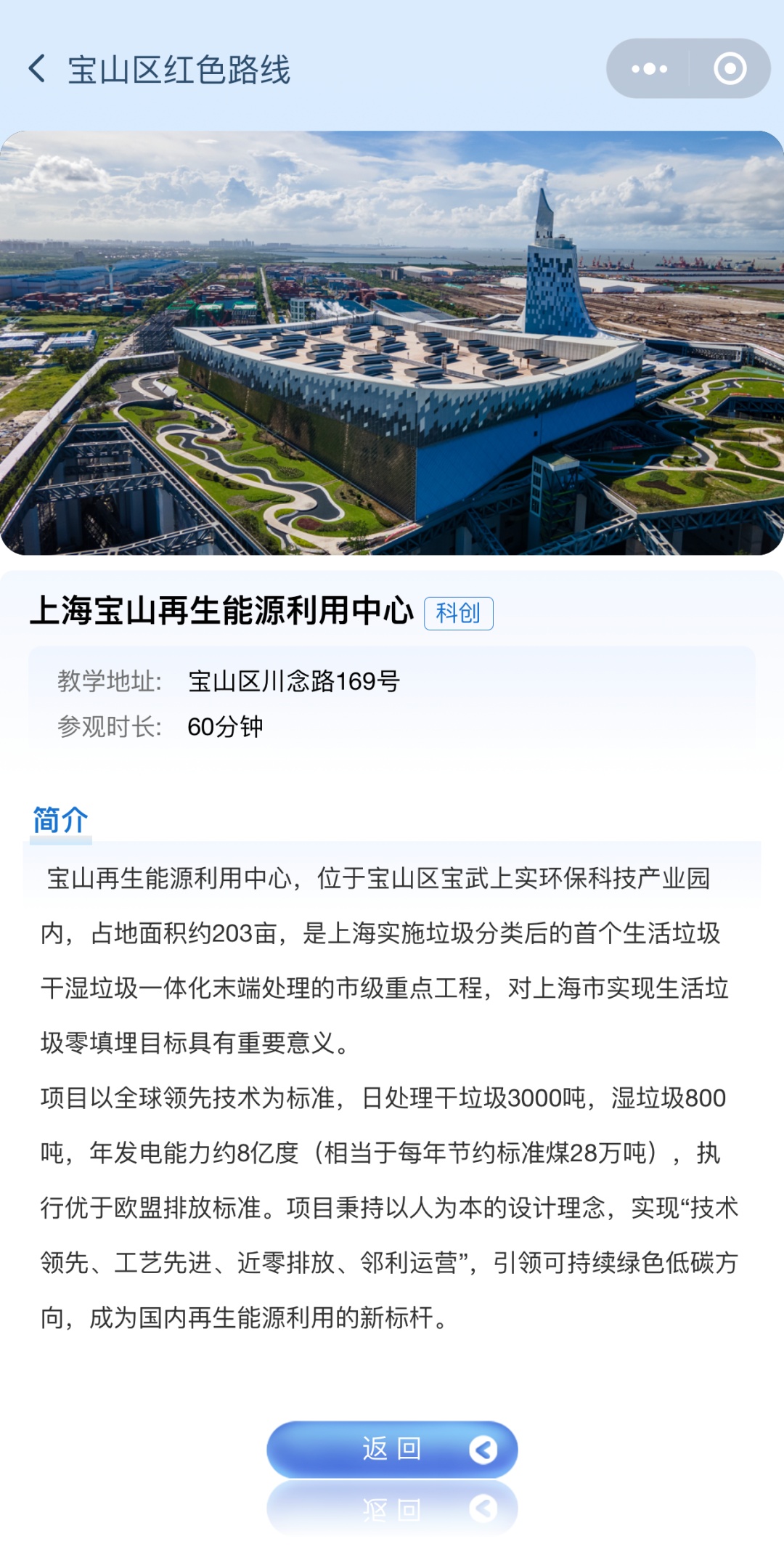 2、通过街镇地图页点击“罗泾镇”,选择“上海宝山再生能源利用中心”可查看教学点简介。