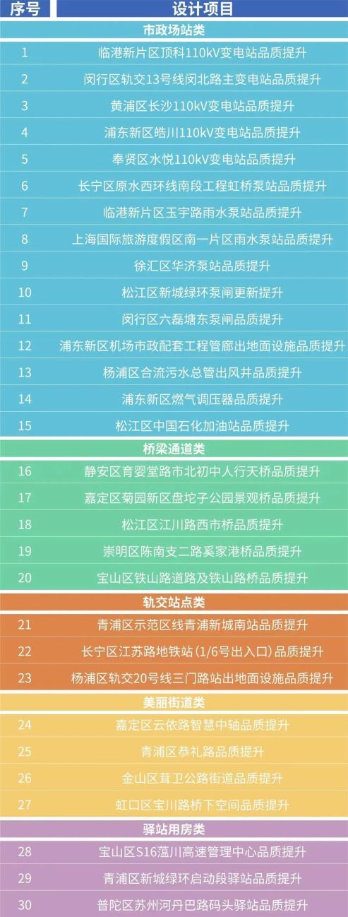 本次竞赛精选30个小型基础设施设计项目,共分为市政场站、轨交站点、桥梁通道、美丽街道、驿站用房五大类型,覆盖上海市16个行政区,临港新片区及国际度假区2大片区。