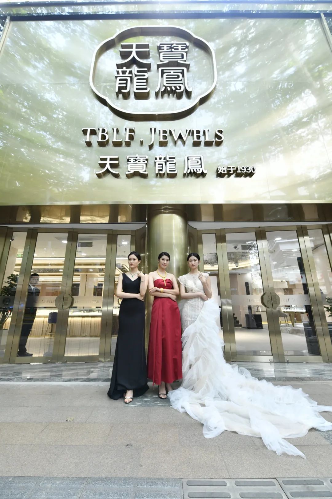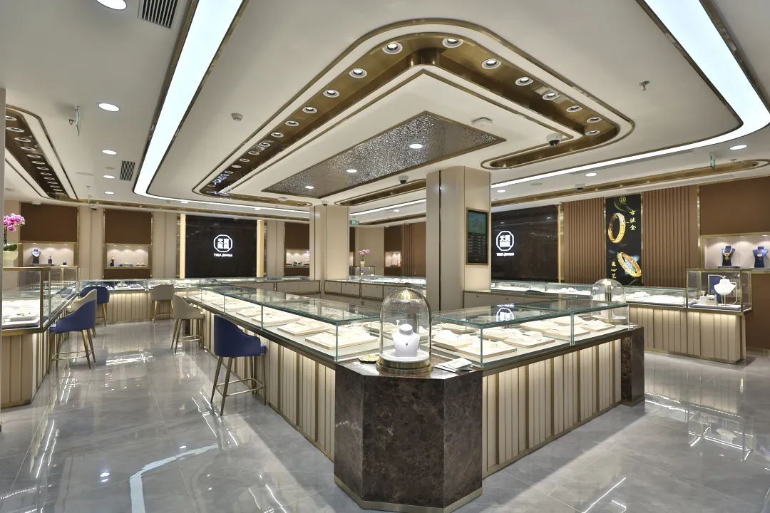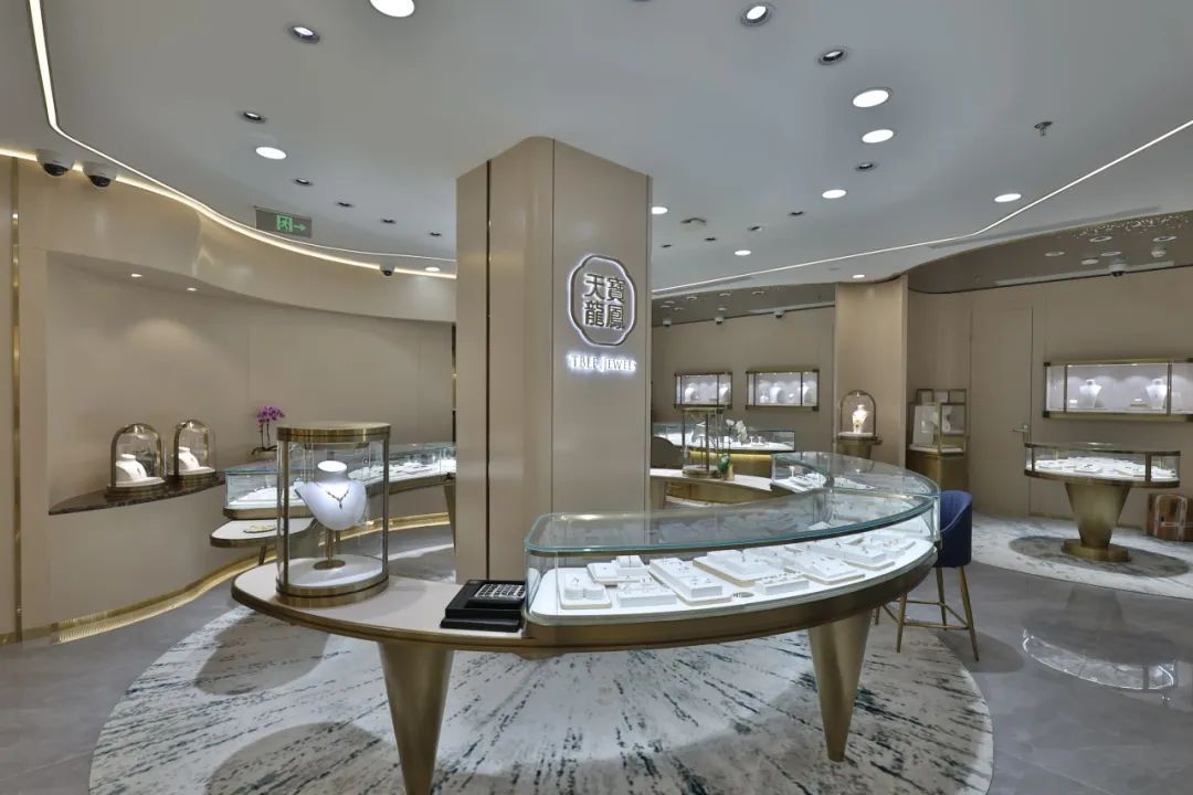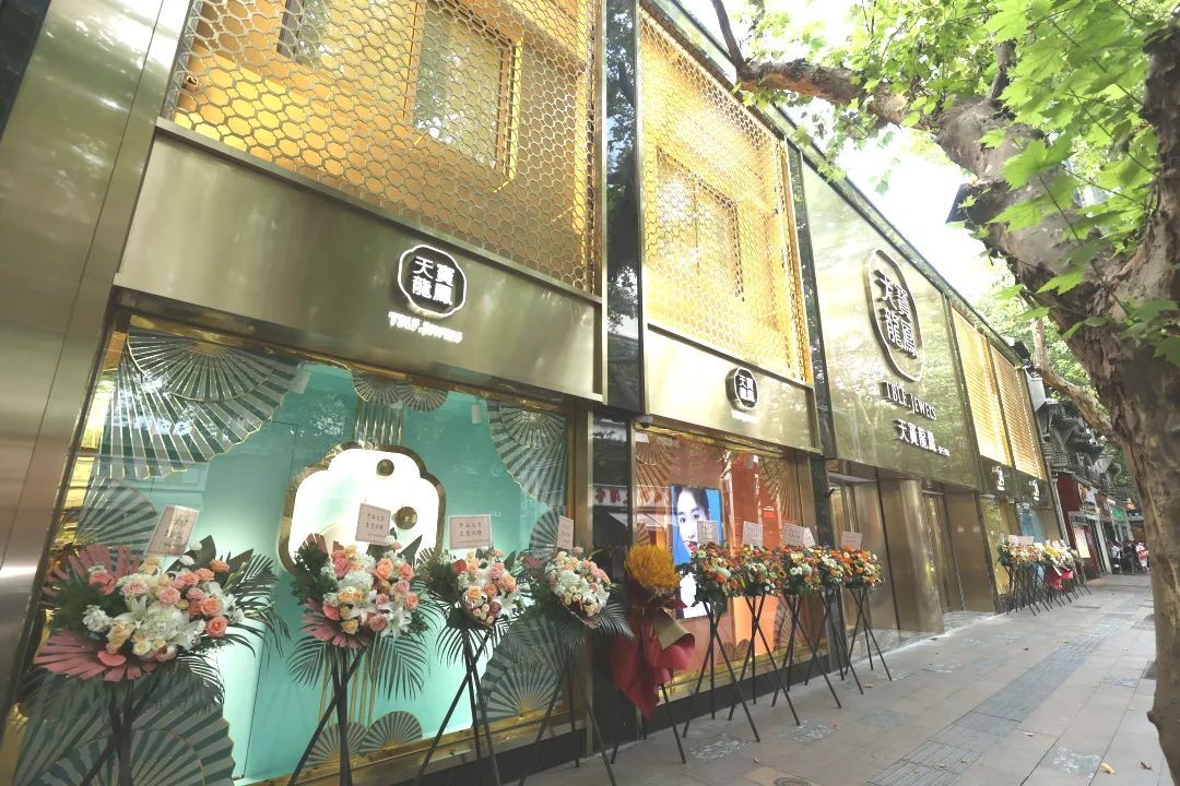 “天宝龙凤”品牌始设于1930年,更新后的外观金装璀璨,楼梯处悬挂着的近5米高的雕像,象征天宝龙凤盛装新开。