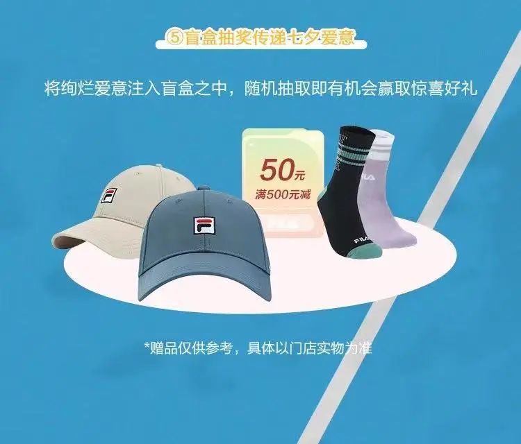 即日至8月22日,店内有七夕专属1314-150元节日限定礼券,参与小红书试衣间话题活动,还有机会赢取FILA情侣款棒球帽。