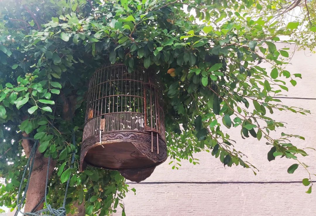 刘贵祥看到绿化带里原本有两棵五针松,他为五针松修剪了造型,还从外面购置了树苗移栽了树。如今树木高大、枝繁叶茂、郁郁葱葱,刘贵祥又在树上挂上了鸟笼,“这个鸟笼是开放的,我放点水、放点食,一直有鸟自己飞进来吃食的”,刘贵祥开心地介绍说,这样一来,居民们走过路过都有一个赏心悦目的地方了。