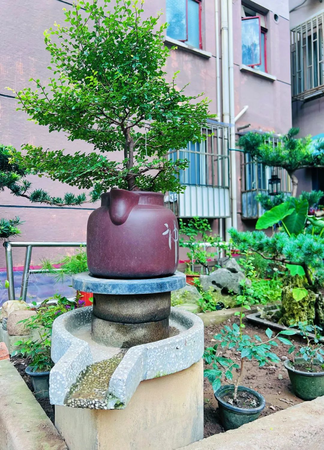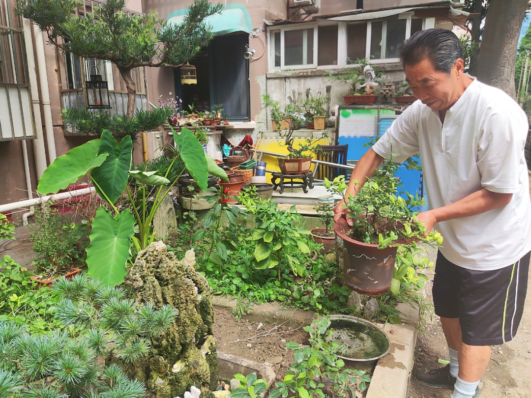 家住50楼底层的退休老人刘贵祥十分爱好养花,当他看到家门口的绿化带光秃了,就想到将自己多年来购置的盆景摆放出来,又添置了假山、紫砂壶盆景和各种小品建筑。