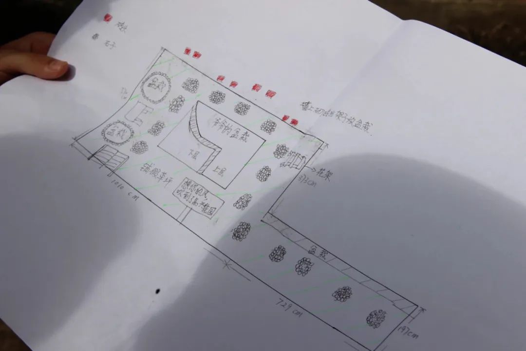 随后,孩子们又在老师、社区工作人员的带领下,自己拿来了尺,手工测量了绿化带的实际面积,并一起讨论并绘制设计图。三(6)班同学林佑欣还和其他同学一起画了设计图纸。