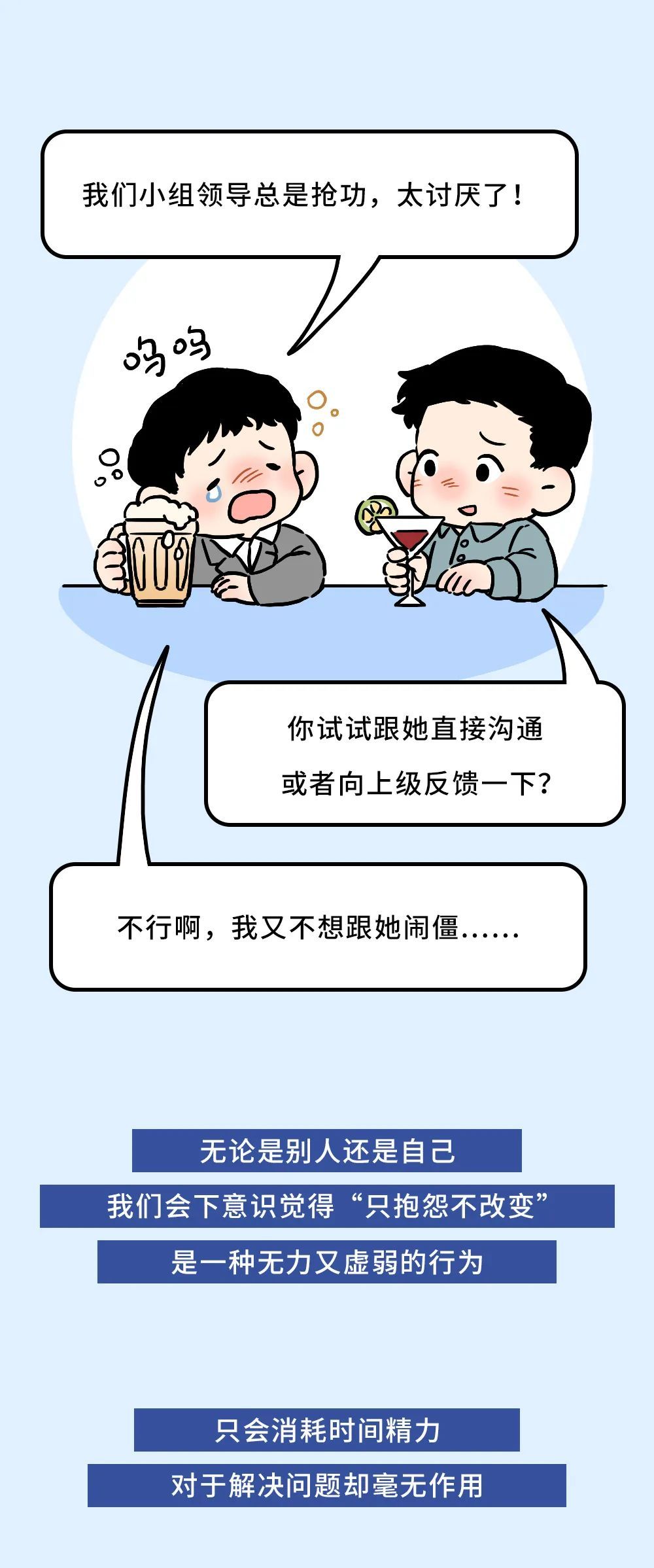 现实却往往是,大家会陷入一个“只抱怨不改变”的无力循环里,并会生出很多自责和怨怼。