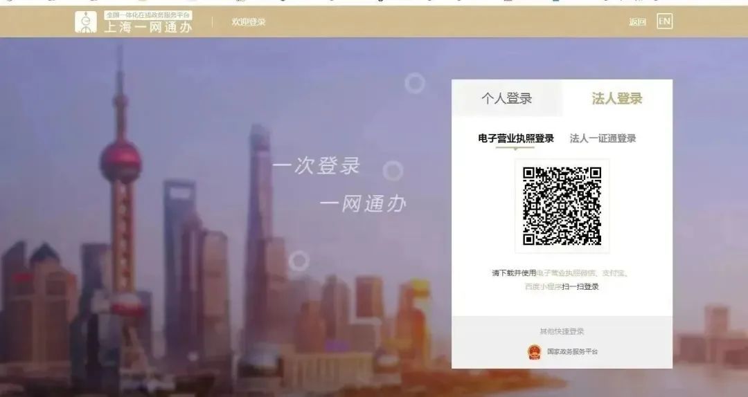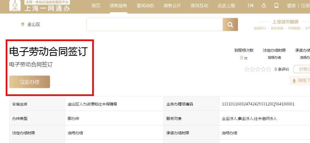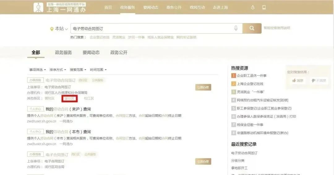 用人企业在上海市“一网通办”首页搜索“电子劳动合同签订”后选择“金山区”,通过电子营业执照或法人一证通登录操作。