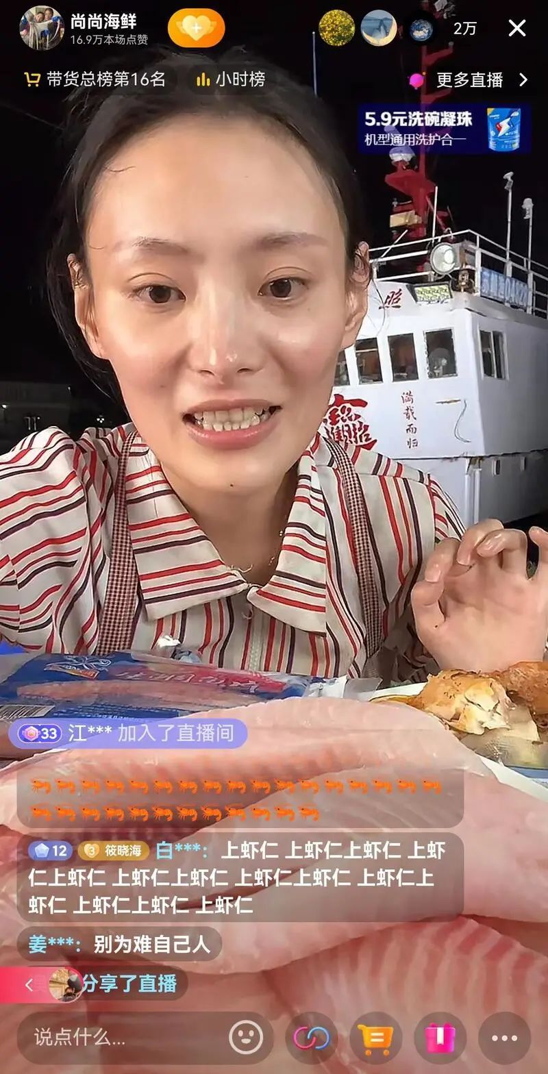 主播尚尚正在直播中。海鲜直播间一下被送上风口浪尖。尚尚评论区的留言还在不停翻滚更新,“这几天可能问题不大,一个礼拜之后真不敢吃”“谁知道有没有辐射,不能吃了,白给也不能吃”“趁早转行吧,卖海鲜的快失业了”……类似的风凉话一直跳出来,她怎么也翻不到底。这样的场面让尚尚一时不知所措。她声音发抖,眼中含泪,压抑着哭腔,手忙脚乱地展示产品。看热闹的人很多。尚尚当晚直播间共涌入几十万人,最多时同时在线将近3万人。她的直播账号粉丝量刚过50万,平日里,看她直播的一般不到1000人。据恩贝观察,流量激增的直播间有许多个,“会涌进一大波网络喷子,发表一些不理智的言论,在评论里带节奏,说海鲜有毒,不能吃了。”不过,善意的声音更多。不少网友在评论区声援,还有网友专门跑到账号后台留言鼓励,“中国渔民没有错,主播加油!”日本核污染水排海后,对我国影响几何?本土海鲜能不能吃?记者联系了几位海洋大学的专家学者,得到一致回复:尚未进行相关实验,很难做出科学评估,目前还无法得出结论。不过,在不少消费者看来,我国的海鲜产品也将被污染,几乎已成为既定事实。有人想抓住最后的机会,赶紧囤货。尚尚24日直播间销售额冲到带货总榜第16名。不少人蹲守直播,把虾仁、带鱼段等海鲜成箱买回家,冷冻起来,保质期最长能有2年。尚尚把库存都尽可能放出来,其中大部分是为中秋节准备的囤货,提前一个月卖了。记者观察到,当晚直播平台带货总榜上,前20名中,海鲜直播间占据3席。海鲜品类客单价不高,受众群体也小,如此带货成绩,此前很少出现。也有的海鲜产品已经遭遇冷落。浙江舟山的海鲜主播三旬(网名)直播间便冷清许多。他主要卖舟山梭子蟹,“梭子蟹还是要吃新鲜的、活的,跟鱼虾不一样,没法提前准备。”今年的舟山梭子蟹已于8月初开捕,目前量不大,最近到舟山旅游吃蟹的游客多,价格处于相对高位,但也正常,渔民出海捕捞的产量比较平稳。线下市场价格变动不大,线上看直播的人却明显少了,下单的人也少,三旬说,有些人到直播间看看,问螃蟹还能不能吃,便离开了。销量下降,长此以往,梭子蟹的价格可能会下跌。
