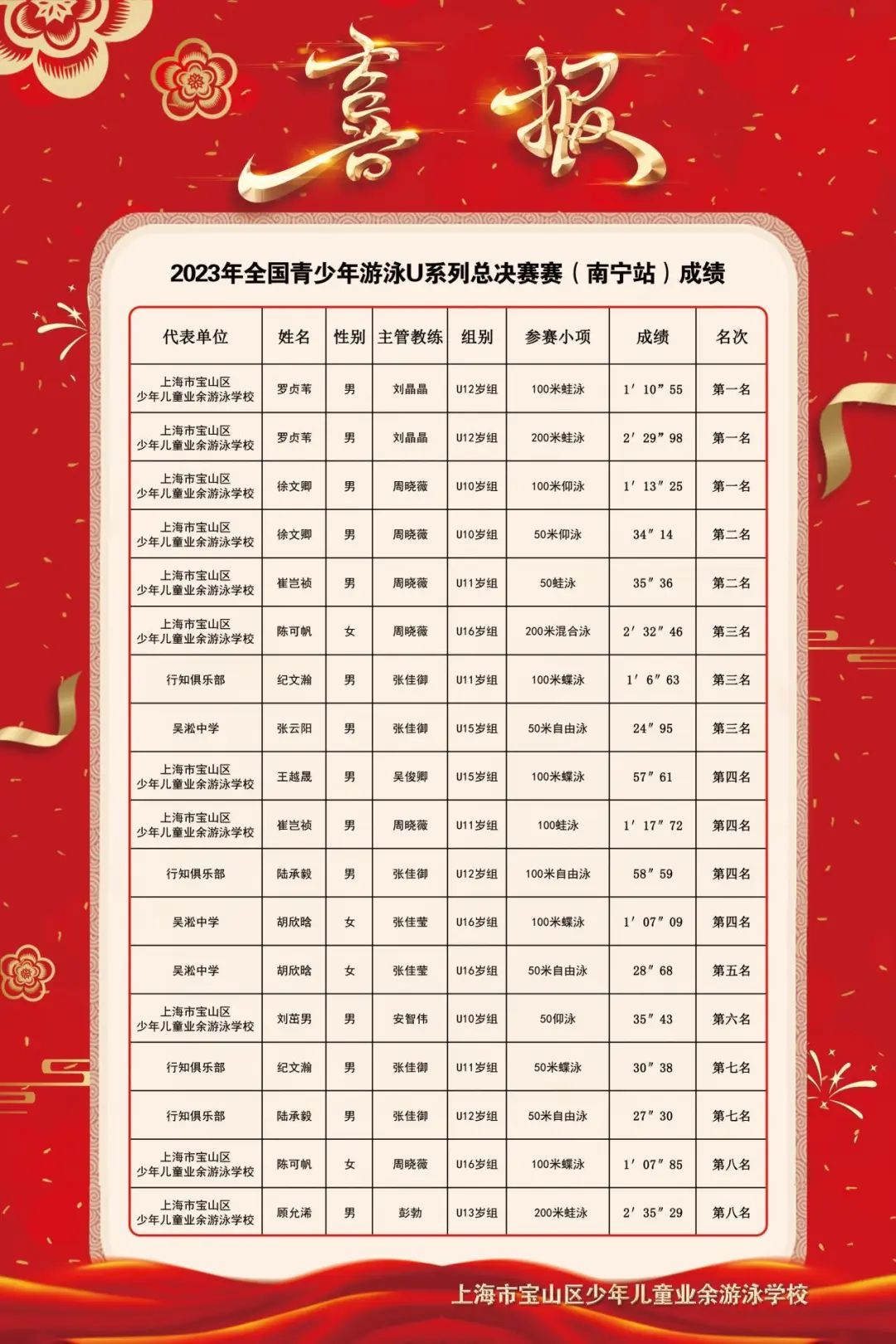罗贞苇:这次我在南宁参加了2023年全国青少年游泳U系列总决赛。第一天获得U12岁组100米蛙泳第一名。对自己的表现不满意,没有发挥出最佳水平。第二天获得U12岁组200米蛙泳第一名。我很开心,突破了自己最好成绩。今后还需要总结经验、从零出发、再接再厉!徐文卿:这次我很荣幸参加了全国青少年U系列比赛,并在总决赛中获得了U10组男子100米仰泳第一名、50米仰泳第二名的成绩,这样的成绩离不开周晓薇教练的细心指导,也离不开我对游泳的热爱与执着。每一次比赛都是一种经历和收获,我坚信心有所期,全力以赴,定会成功!我有乘风破浪的魄力,也有破釜沉舟的勇气,我将在拼搏的路上一直“泳”往直前!