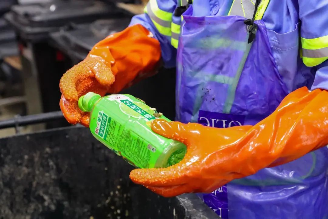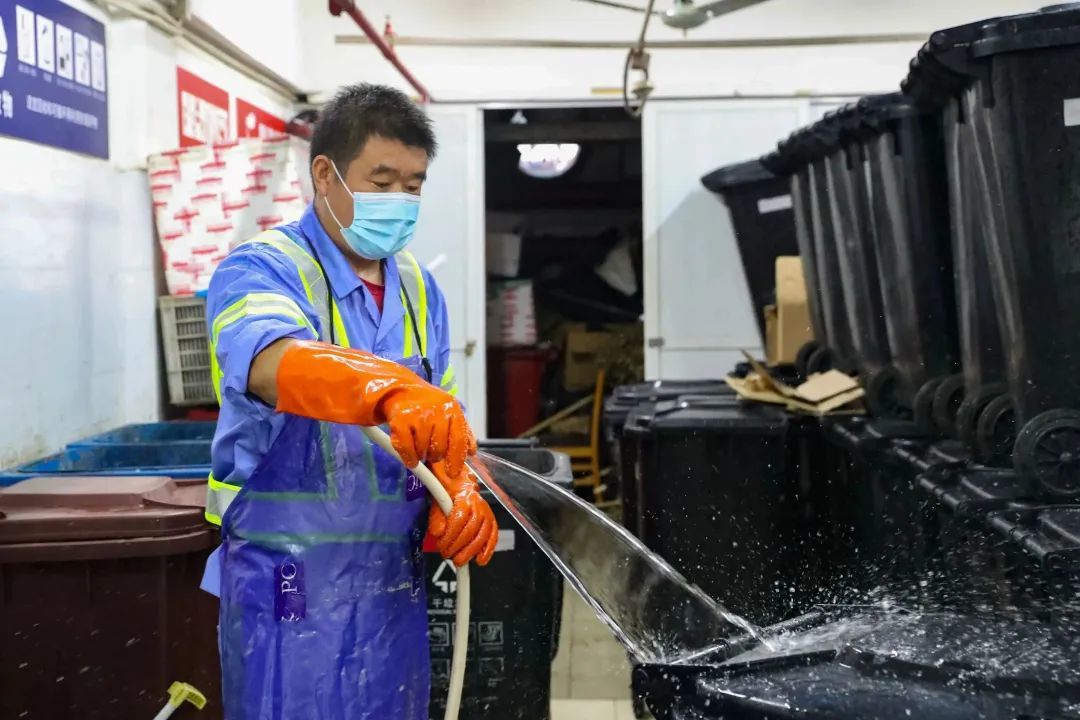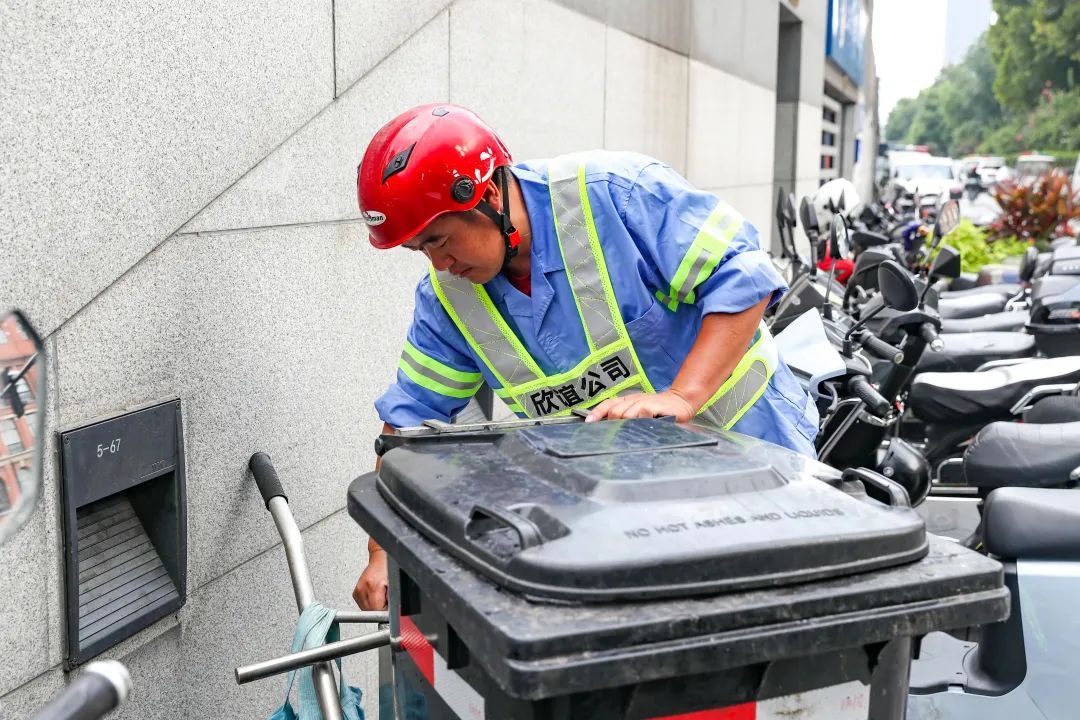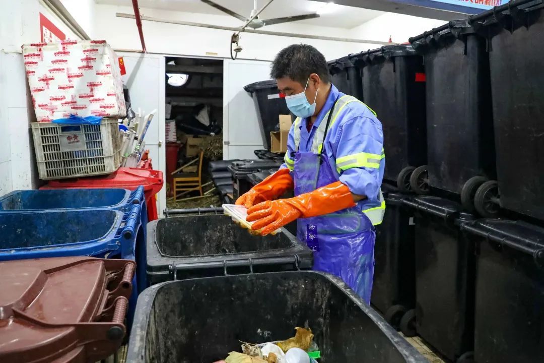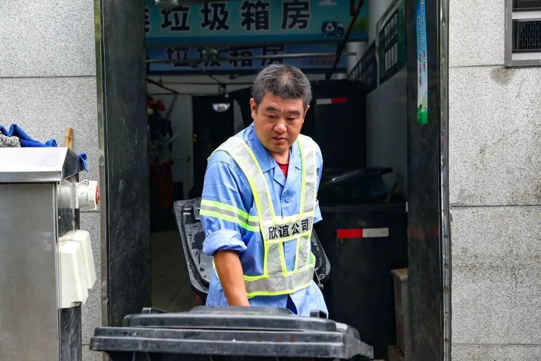 在更换装满的垃圾方桶后,庄英豪要把垃圾方桶运到垃圾箱房,对垃圾进行分拣分类,在高温下工作,他面临的挑战可想而知。汗水湿透了衣服,垃圾的异味和炎热的天气都对他构成了巨大的考验。
