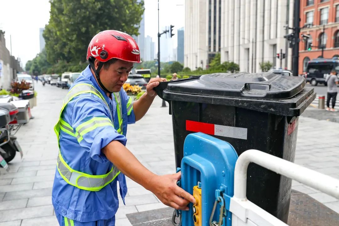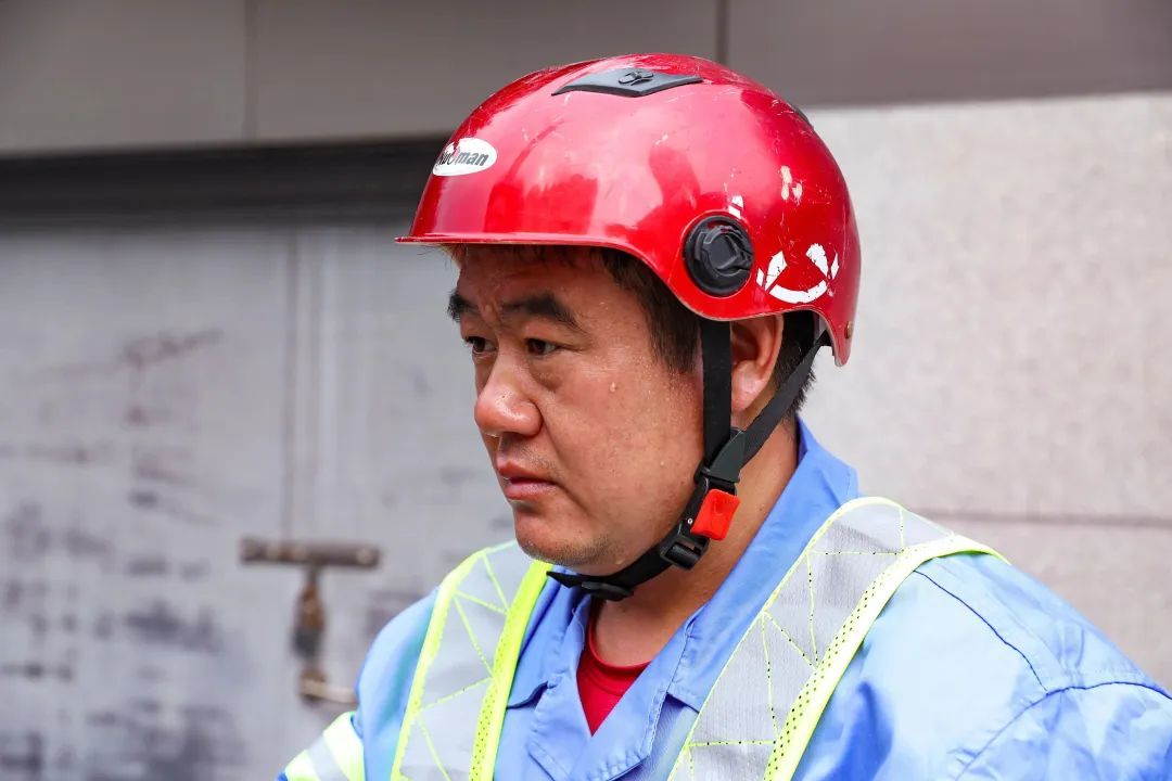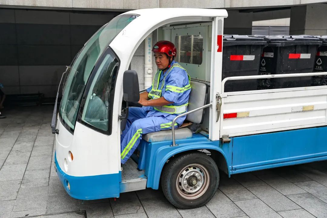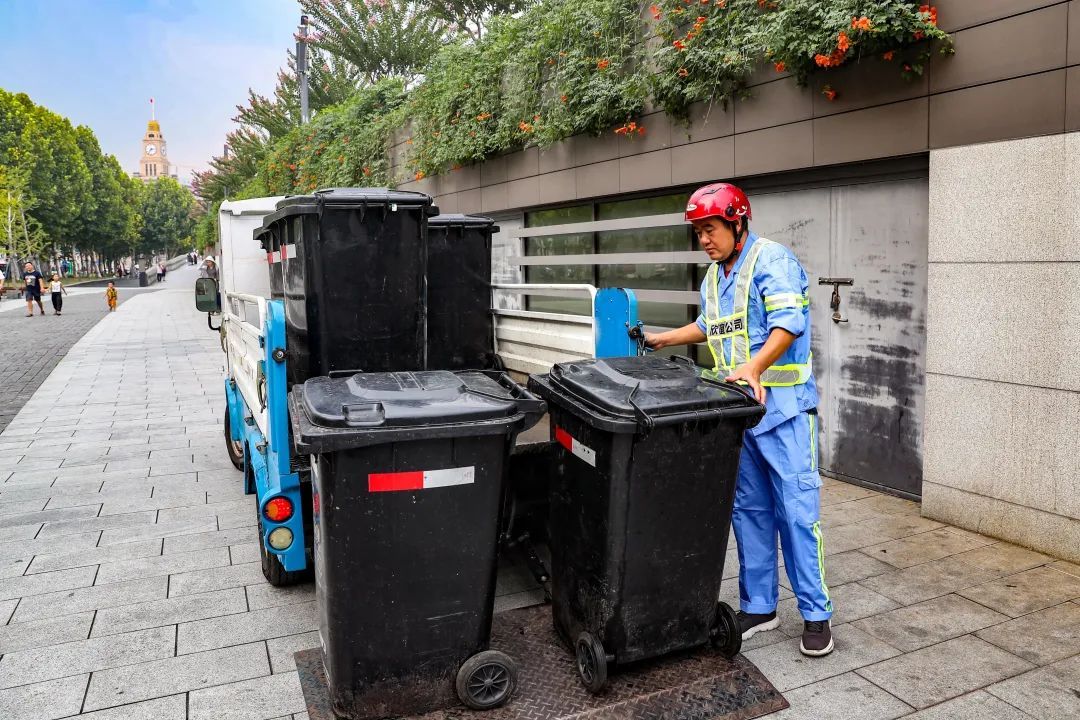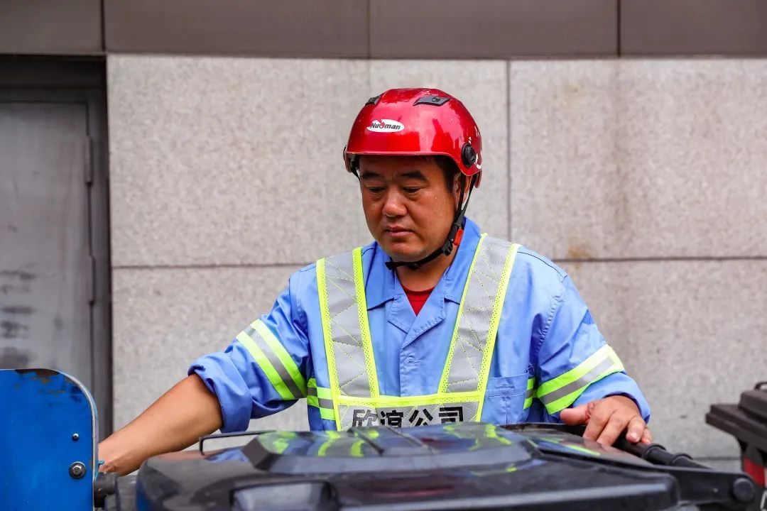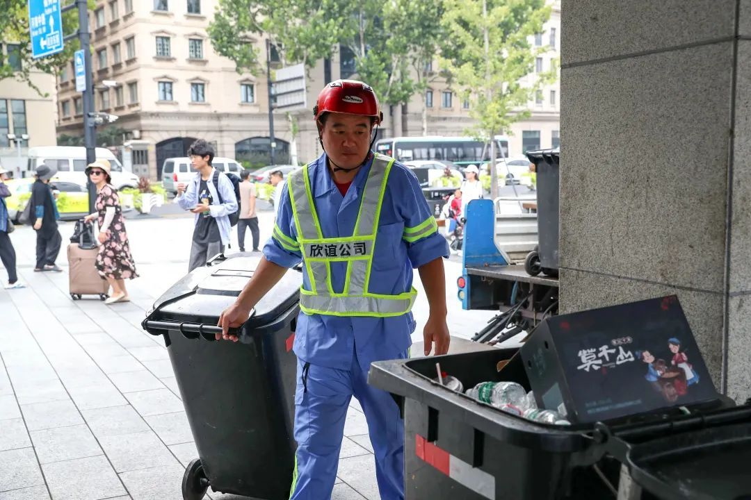 庄英豪是外滩滨水区保洁班的老员工,从事环卫工作已经十多年,主要负责的是外滩区域几十个垃圾方桶的转运分拣,每当哪个点位的垃圾方桶满了之后,他会开着装桶的平板车更换新的垃圾方桶。他每天都要面对堆积如山的垃圾,以及夏日的高温挑战。尽管如此,他始终坚守职责,默默奋斗在外滩滨水区保洁工作的一线。