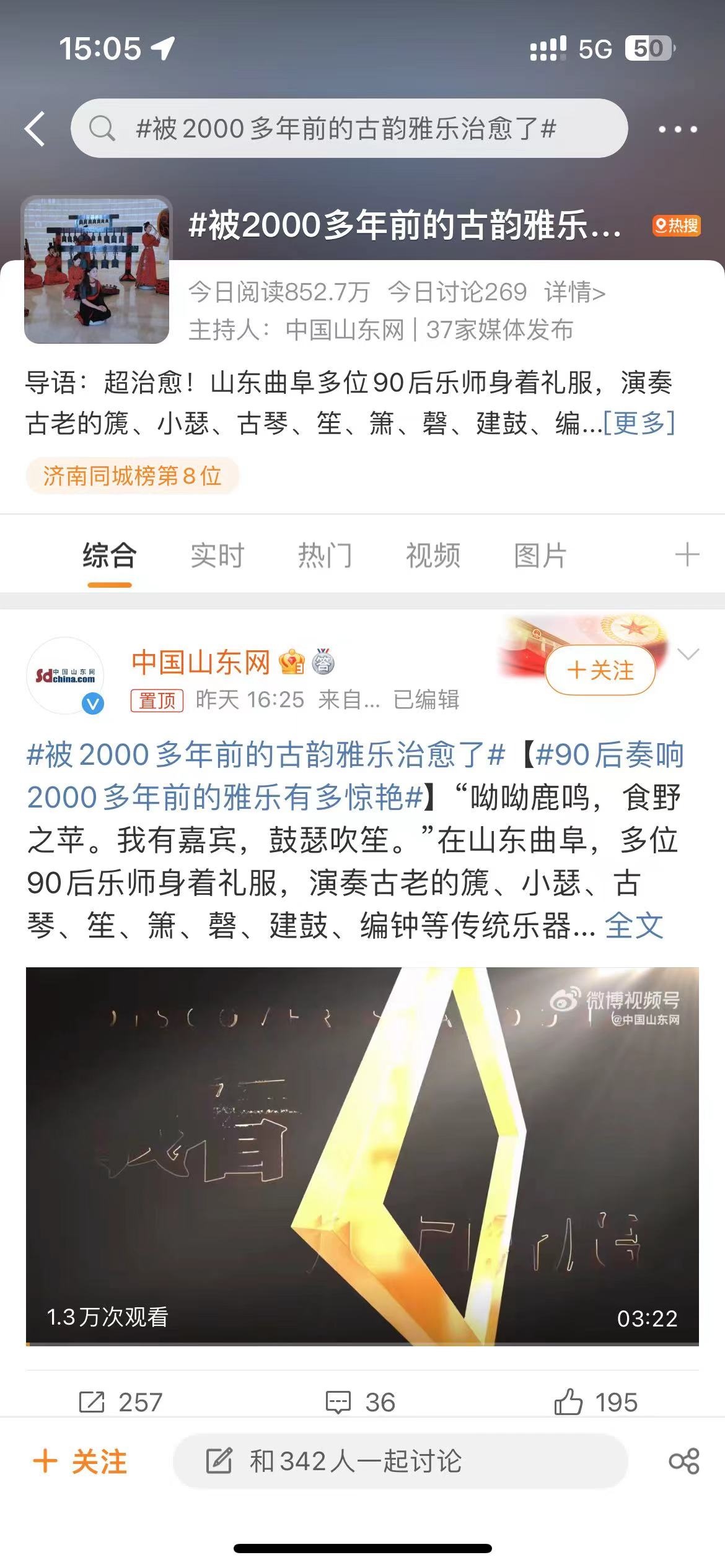 此次孔子博物馆萧韶乐团重现雅乐,同样登上微博热搜。网友们表示,被2000多年前的古韵雅乐治愈了,仿佛穿越到了儒家文化盛行的时代,还有部分网友想亲身参与其中,体验一下传统音乐的千年魅力,这正是“天上之乐”飘入寻常百姓家的最好体现。