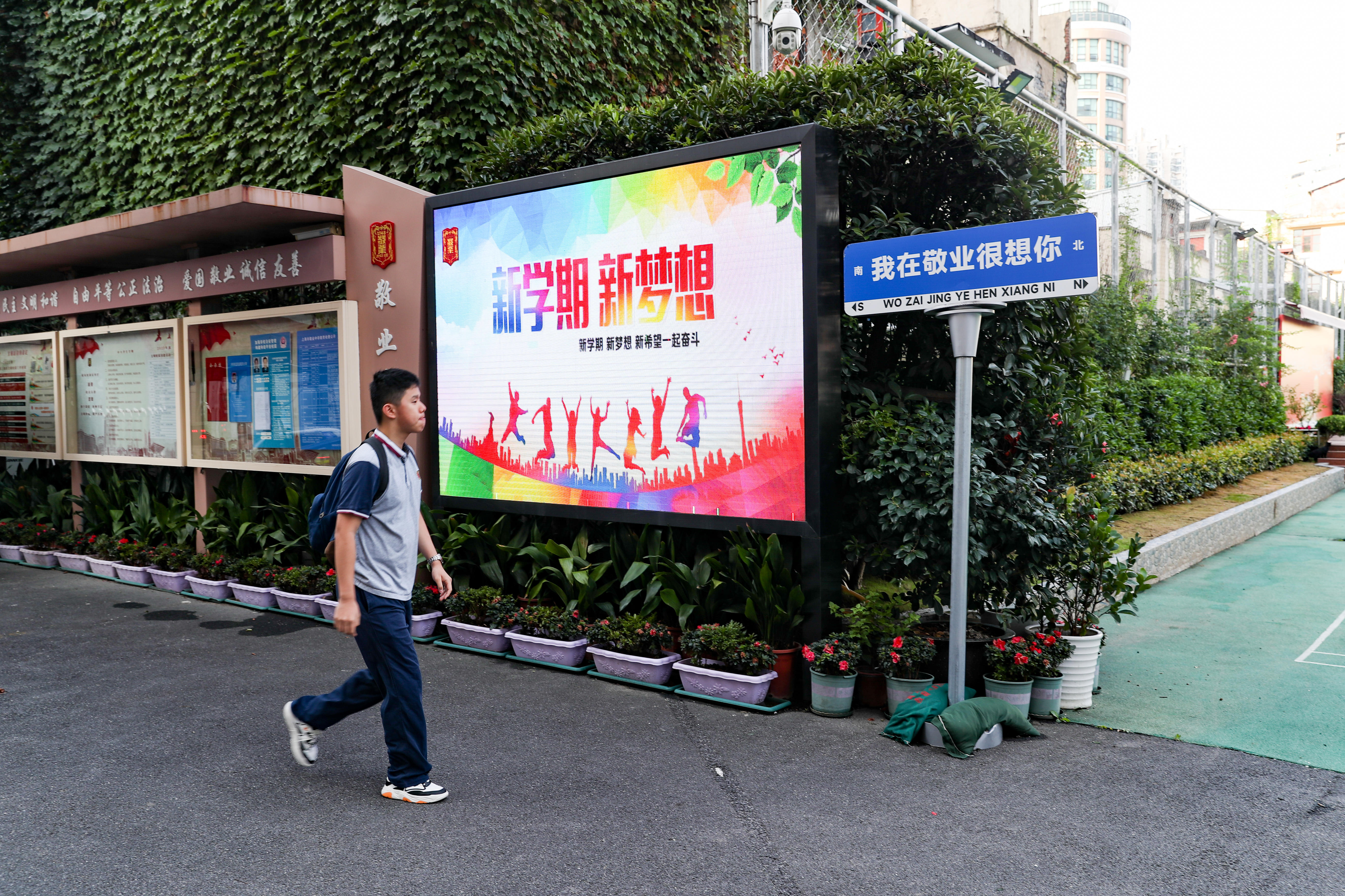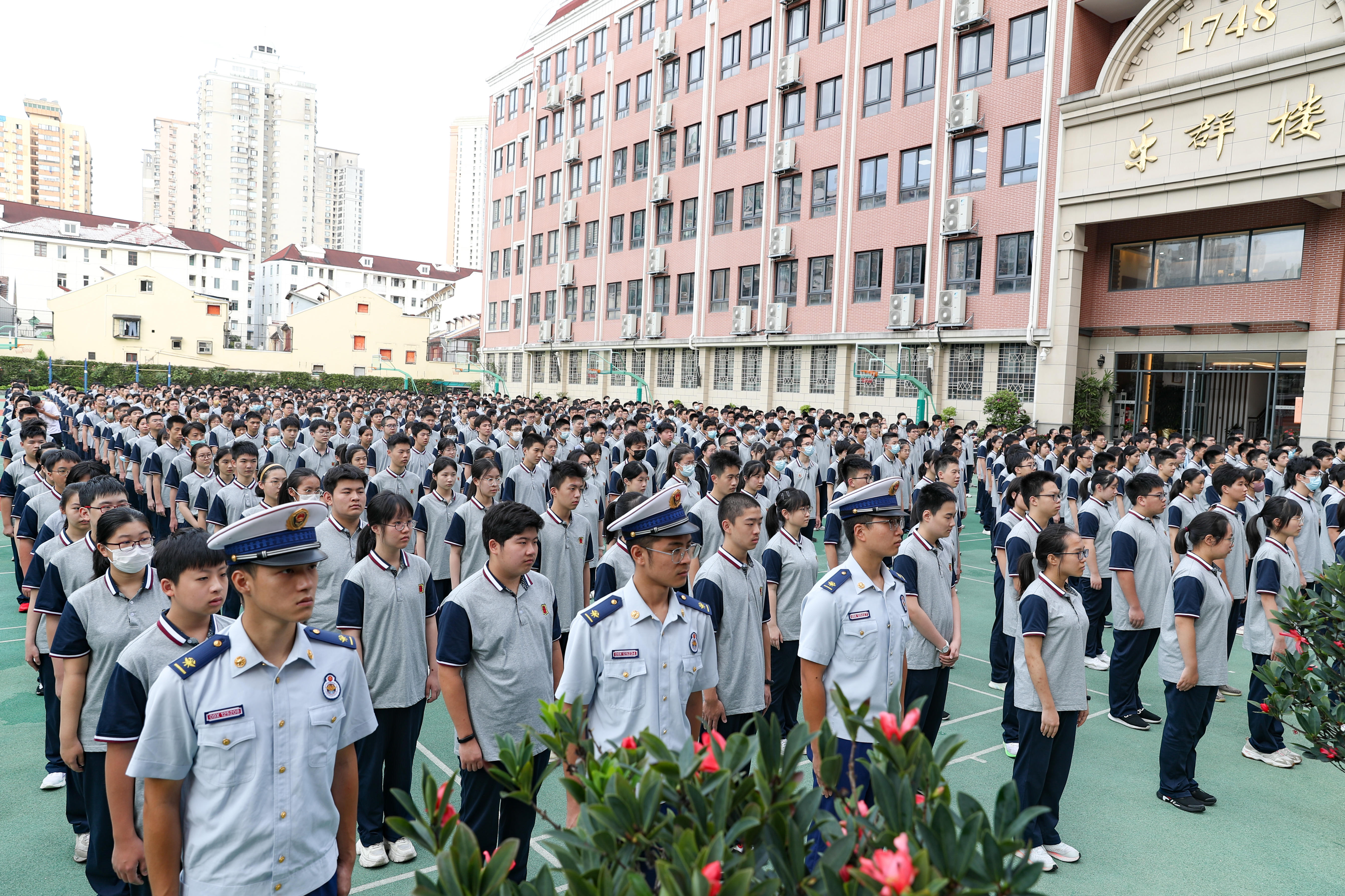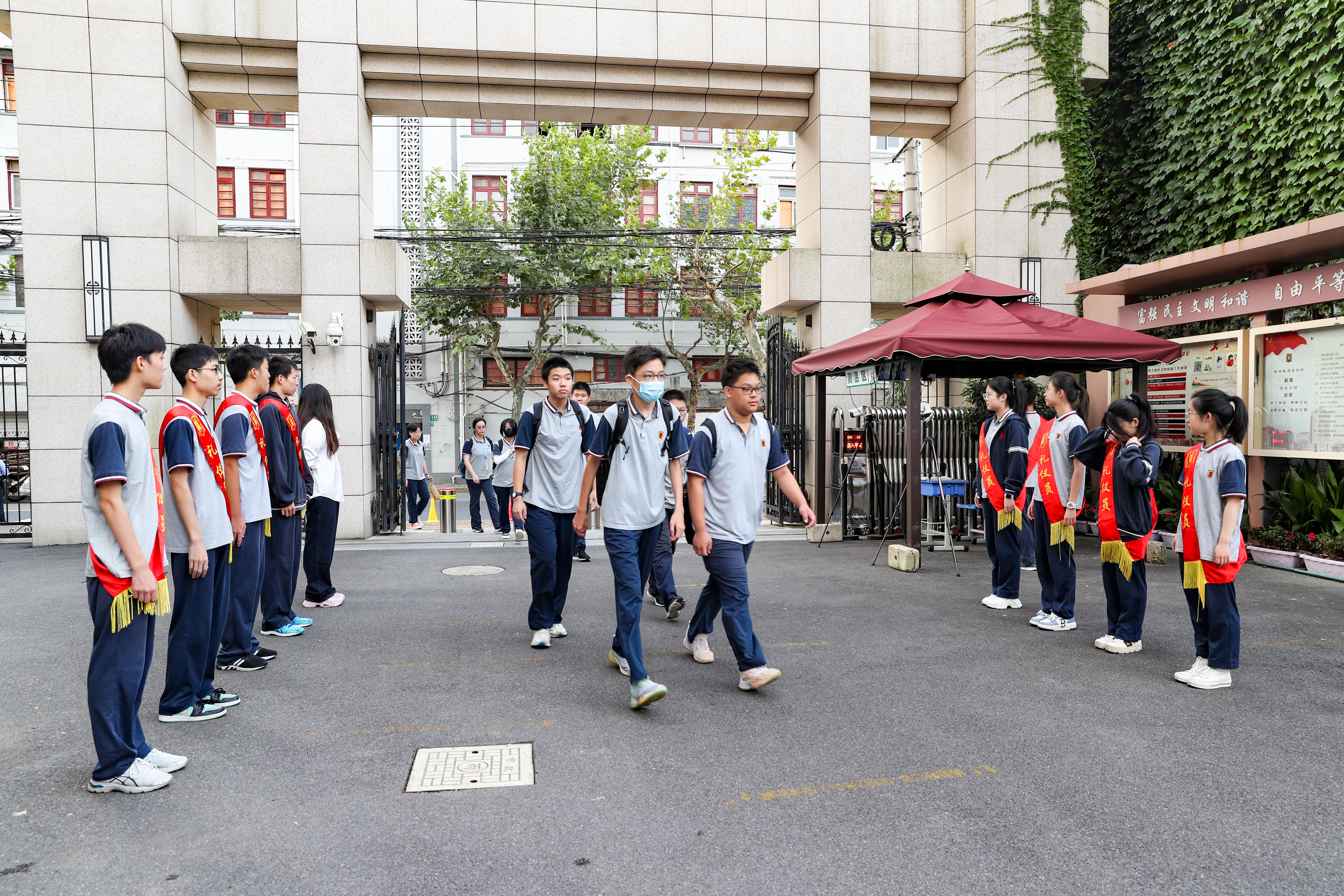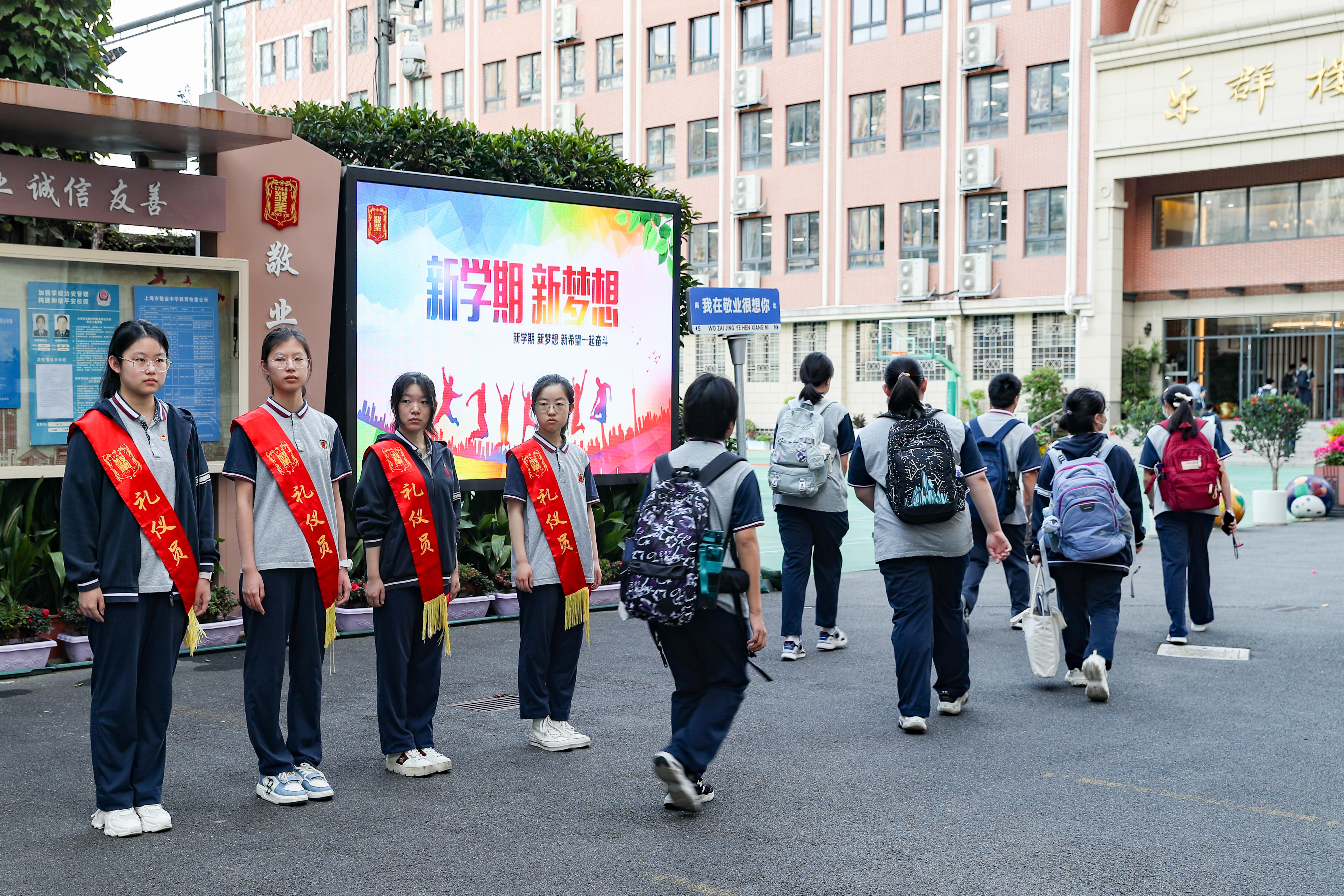 早上7时,在上海市敬业中学门口,由学生和老师组成的欢迎礼仪队已经早早地准备在校门口,迎接着新同学们的到来。学生家长将孩子们送到校门口,与老师们互致问候,传递着对孩子们顺利开学的祝福。学生们身穿整齐的校服,充满朝气地走进校园,迎接新学期的挑战和机遇。