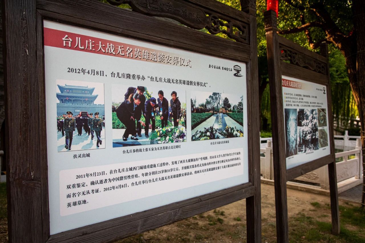 台儿庄在战争中化为一片废墟,众多军人牺牲,至今大部分姓名没有能够找到,许多无名英雄长眠于此。在台儿庄古城西北角,出土了两具无名烈士遗骸,现在古城西城门内复原展示。经常会有学生、游客为英烈敬献鲜花,表达真挚的缅怀之情。