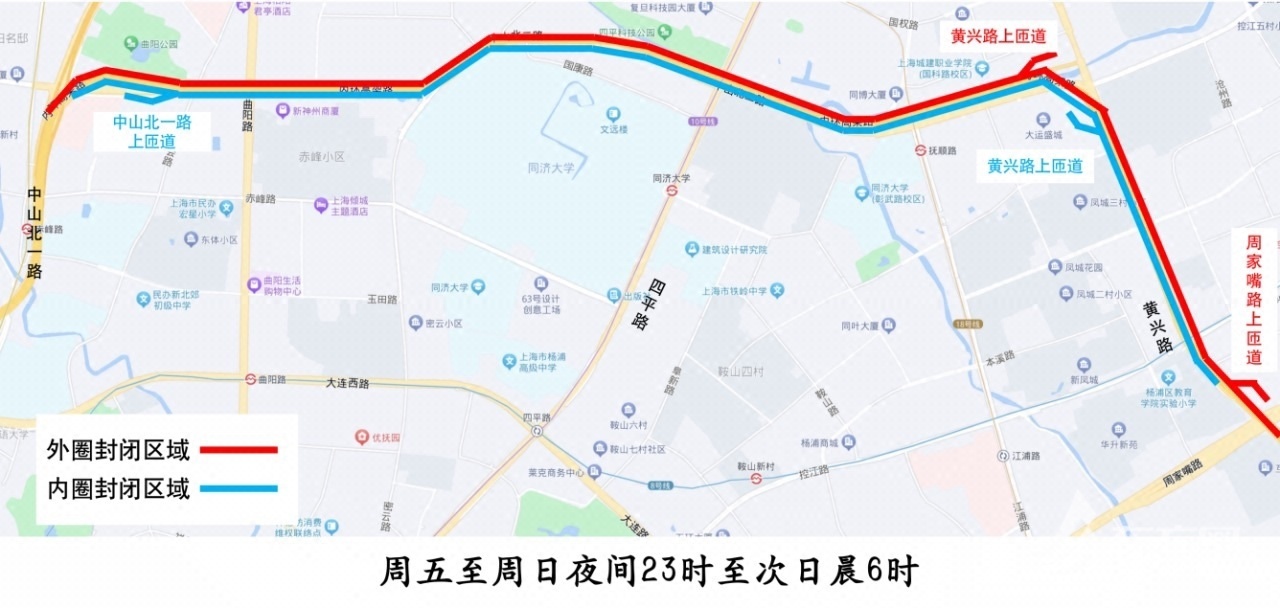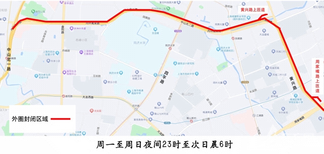 内环高架内圈(中山北一路-周家嘴路):周五至周日23时至次日6时主线封闭,车辆需从中山北二路下匝道驶离高架主线,前方中山北一路上匝道、黄兴路上匝道关闭。