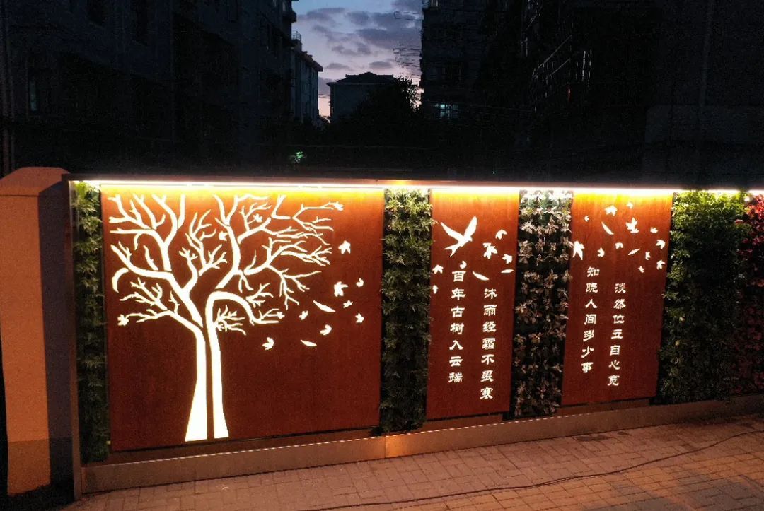 另一方面通过锈钢板装饰的古诗词与公园内古树相呼应,“丛林树影”与园内多年生长的乔木林树影互相映射;使得街区与历史名园文化融汇,体现了街区景观的“+公园”理念。