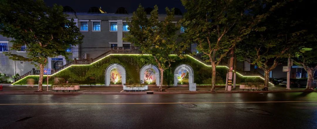 此处绿墙单块高达9米、长超50米,是静安区最大体量景观绿墙。在设计方面采用鲸鱼作为主题元素,绿墙的夜景营造沿鲸鱼和波浪图案布置造型轮廓灯,在夜间突出鲸鱼造型。