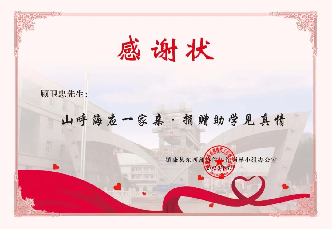 今年,镇康县东西部协作工作领导小组办公室特别制作感谢状,以“山呼海应一家亲·捐赠助学见真情”的寄语表彰顾卫忠先生捐款助学的善举;四位大学生也写下感谢信,向从未谋面却真心相连的顾卫忠介绍各自的学校生活,并表达真挚的感激之情。