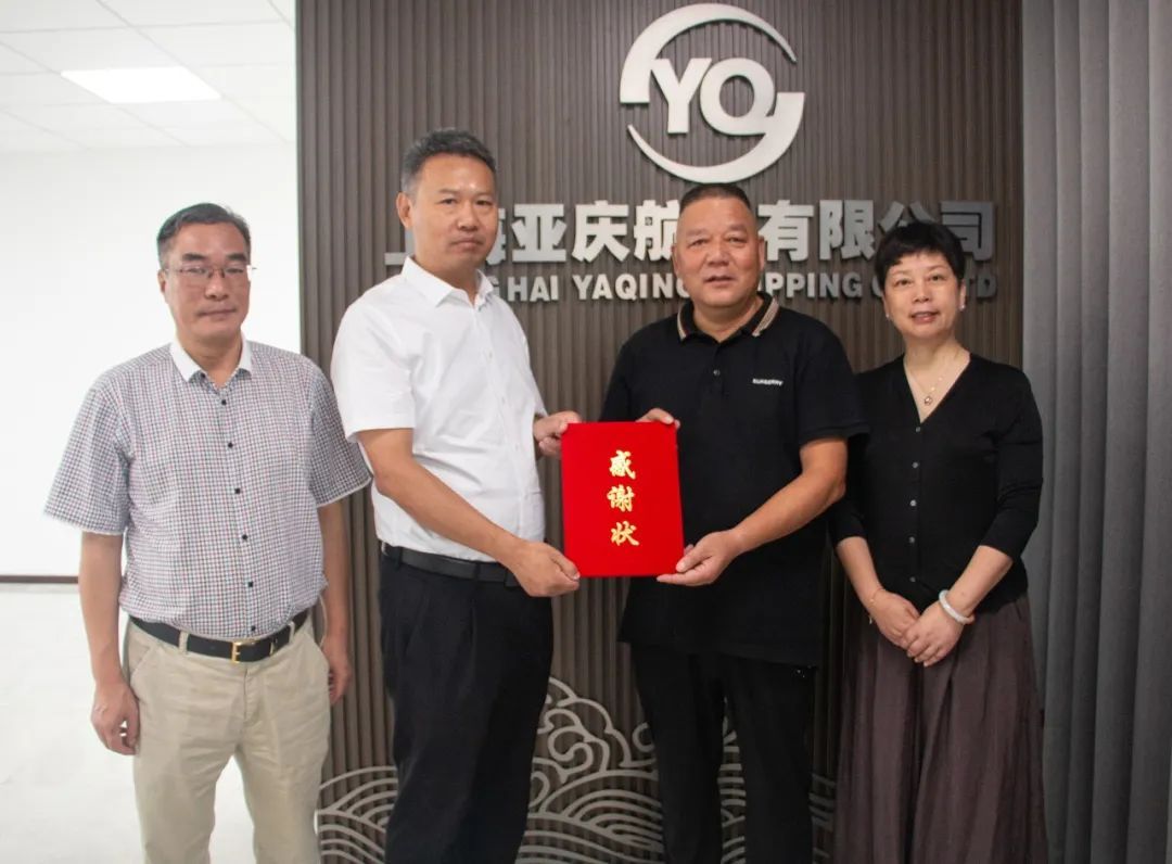 陈新(左二)将感谢状递交给顾卫忠(右二)