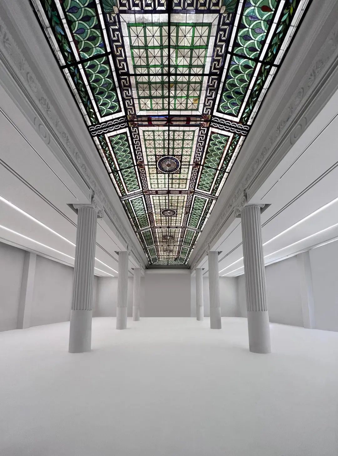 走进宽敞亮堂的内部空间,两排爱奥尼式巨柱承托着的由植物母题和回形纹饰构成的巨大彩色玻璃穹顶出现在眼前,要知道,在外滩地区,类似面积的完整的彩色玻璃天窗并不多见。