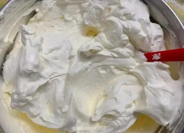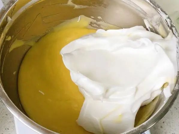 步骤3:蛋白、蛋黄糊混合:刮刀取1/3蛋白加入蛋黄糊中翻拌均匀,不可画圈容易消泡;将拌匀的面糊倒入剩余2/3蛋白中,继续用刮刀由下往上翻拌,至完全均匀。混合过程中动作要轻快,一般1—3分钟内完成,时间过久容易消泡。