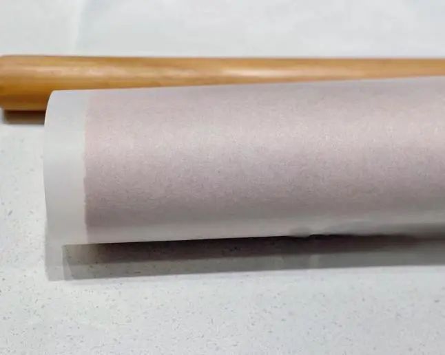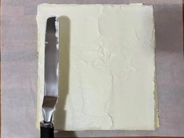 步骤7:蛋糕的卷制:蛋糕坯下铺一层硅油纸,蛋糕表面抹上适量打发后的淡奶油。