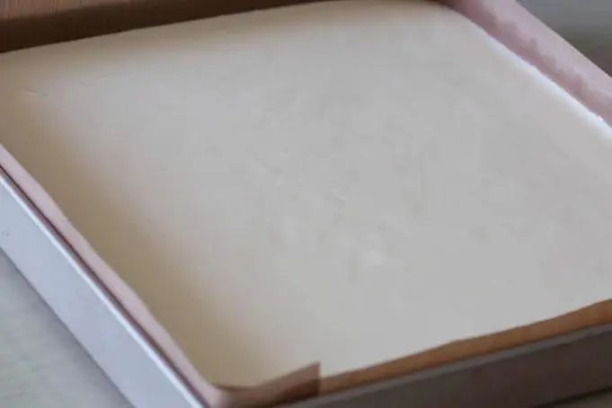 步骤4:模具成形:28×28CM烤盘使用前垫硅油纸。将面糊倒入烤盘内,表面刮平,轻震两下消除大气泡,立刻进入烤箱。