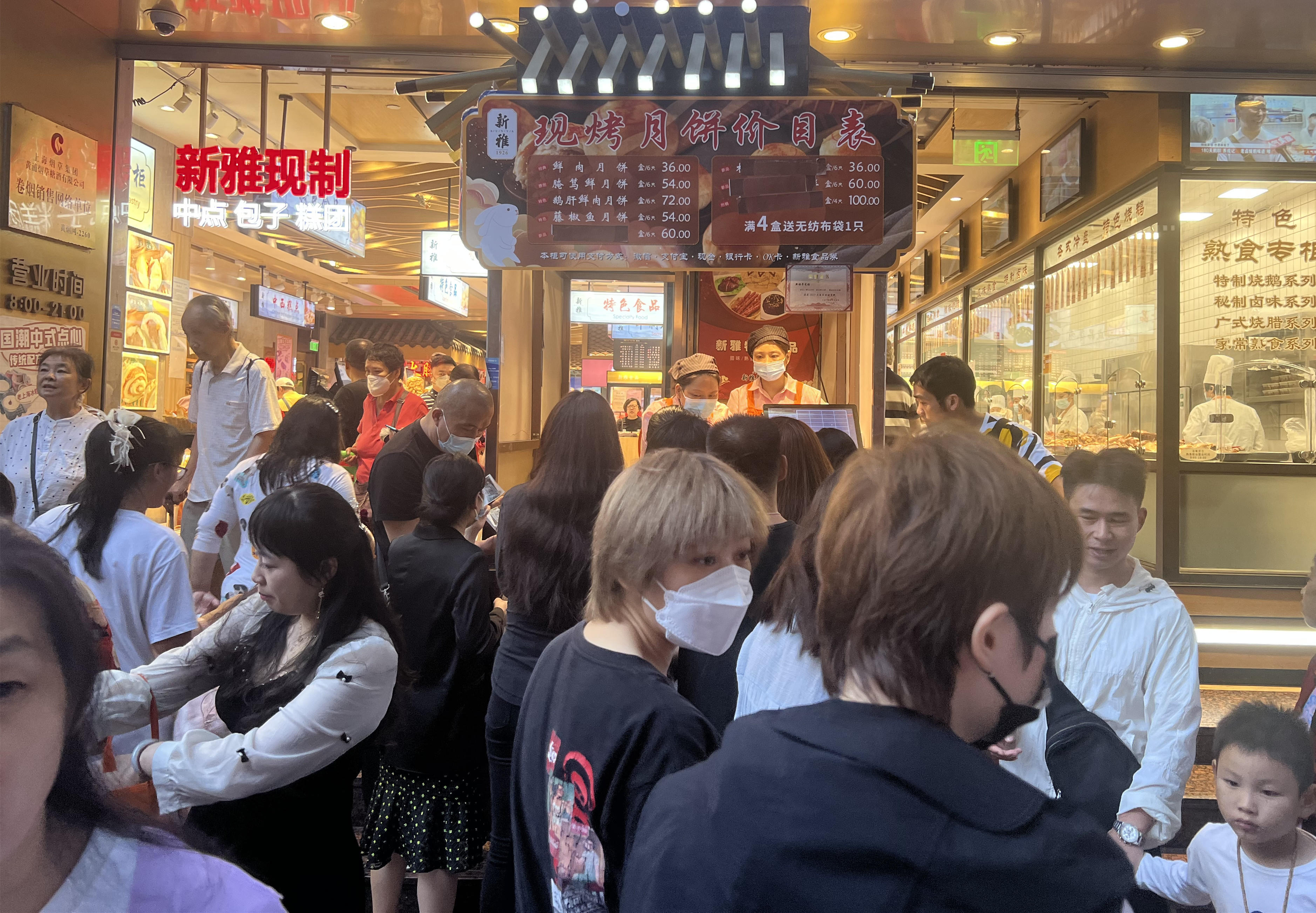 “一盒腌笃鲜鲜肉月饼几个?”“6个。”“好的,给我一盒。”10月2日,步行街老字号新雅粤菜馆(以下简称新雅)的现烤月饼柜台前,排起了小长队,现烤鲜肉月饼散发的香气,引得游客们纷至沓来选购一番。